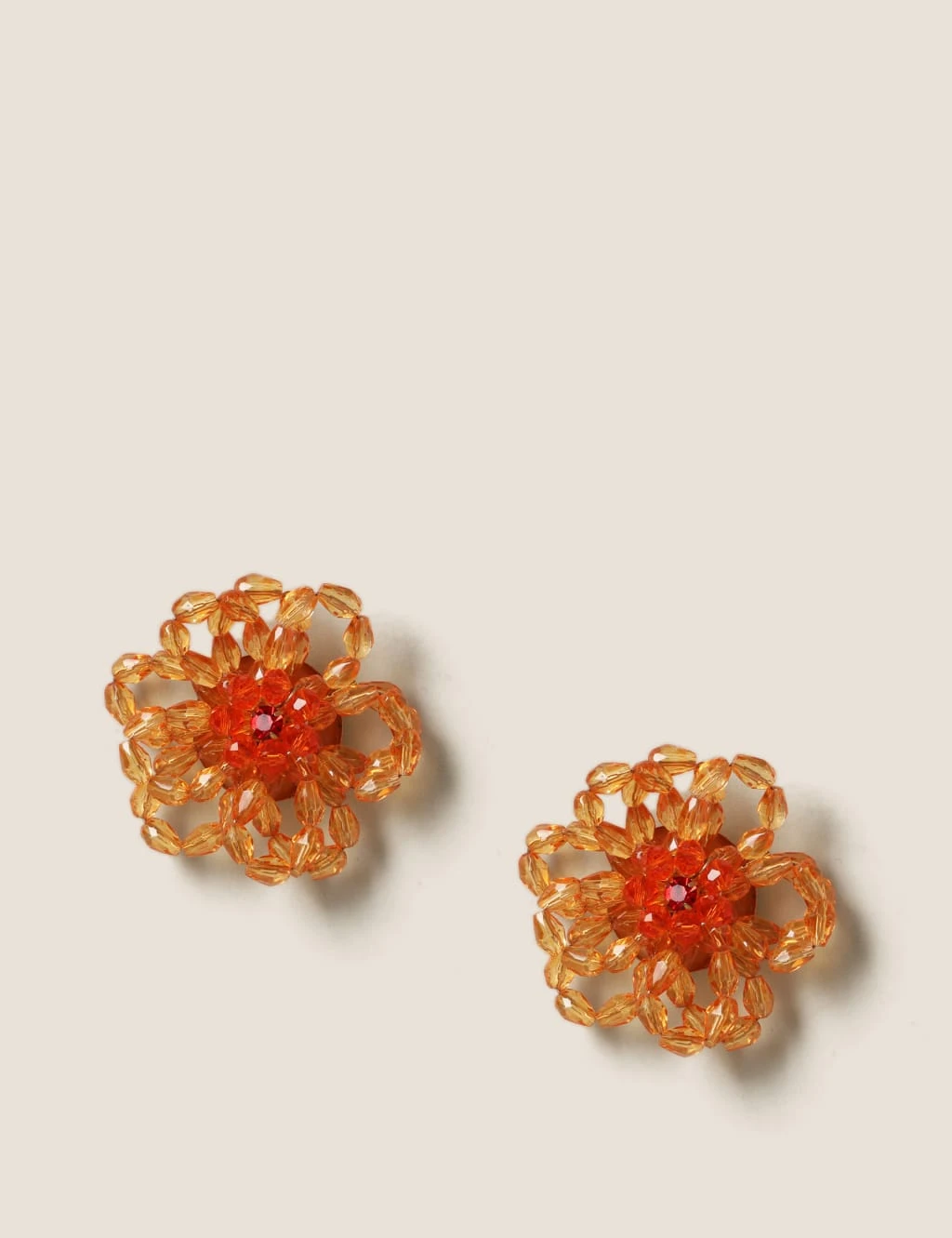 These flower shaped beaded earrings are the perfect shade of orange for summer. The bright pop is perfect for your summer accessories and fun holiday pieces. The intricate detailing of the beads shaped into the flower with beaded centre detailing.