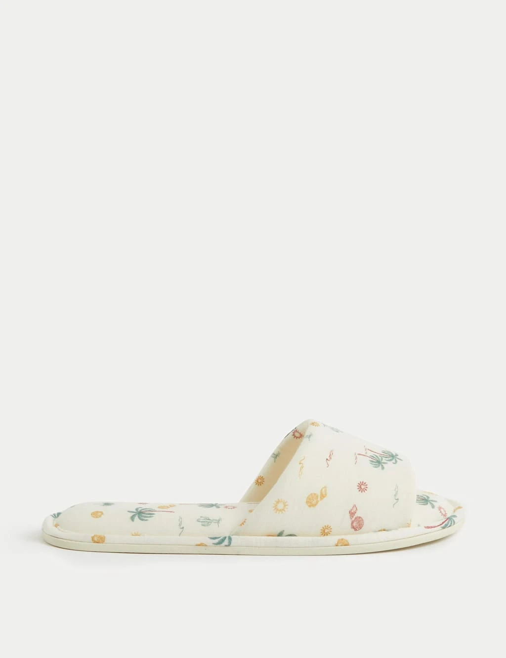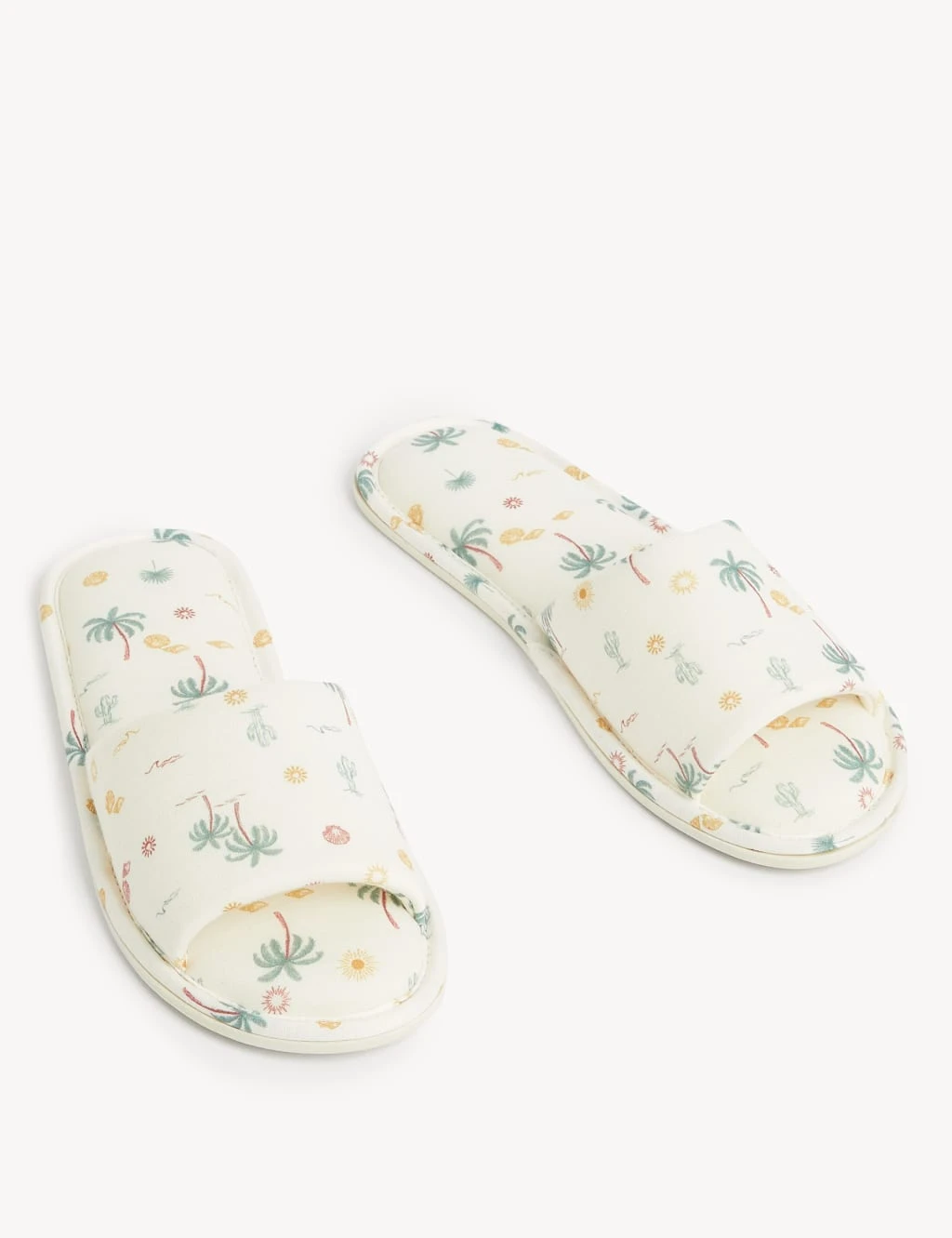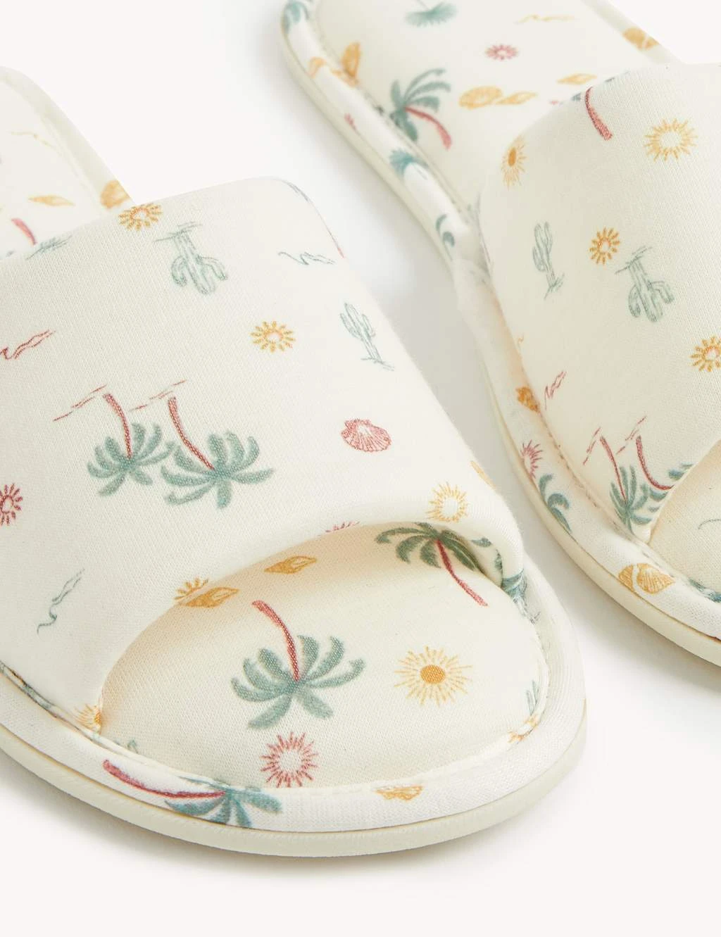 Decorated with palm trees, shells and suns, these mule slippers will make a stylish addition to your loungewear collection. Comfortable open toe style with soft, padded soles.