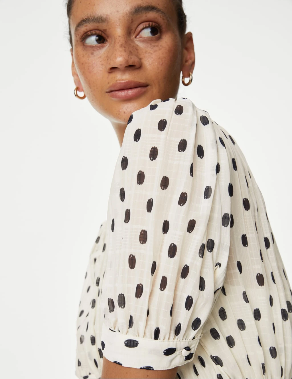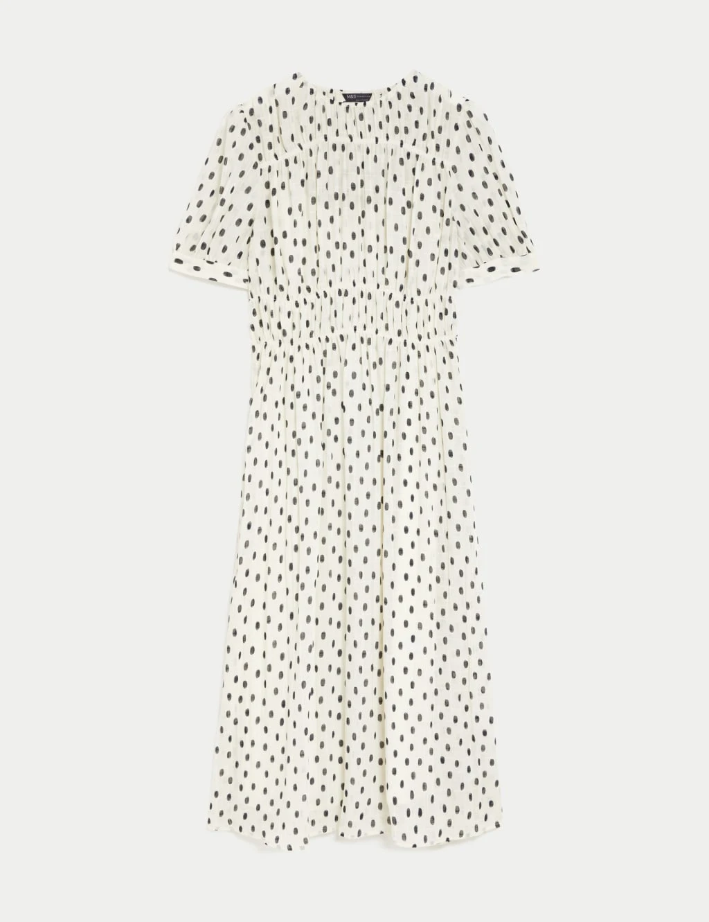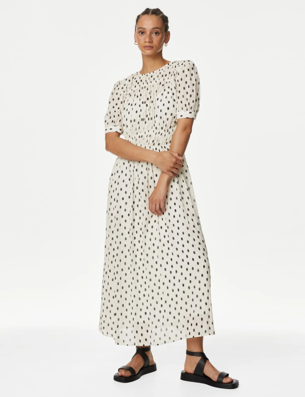 With its delicate polka dot pattern, this midi-length dress is brimming with timeless elegance. It’s cut in a regular fit, with gathered cuffs that add stylish volume to the short sleeves. Smocked detailing at the round neck and waist creates a striking silhouette.