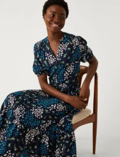 Embrace pretty print with this light and airy shirt dress. It’s designed in a regular fit, with a button-down front and a tiered midi-length skirt for a swishable effect. A belted waist and elegant v-neckline offer a flattering silhouette. The short sleeves finish in elasticated cuffs to create a touch of breezy volume.