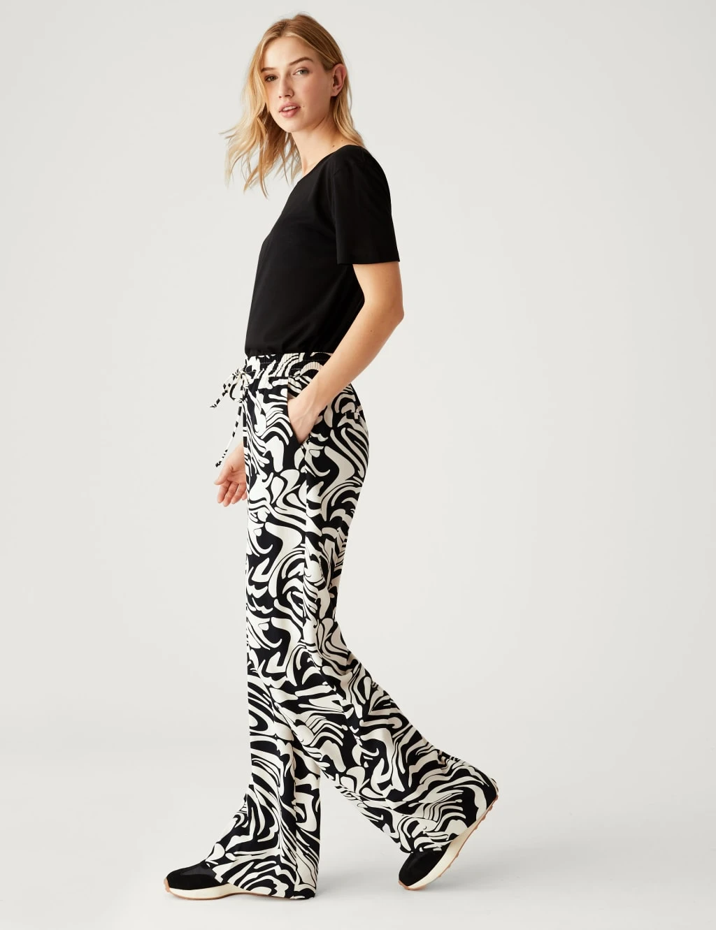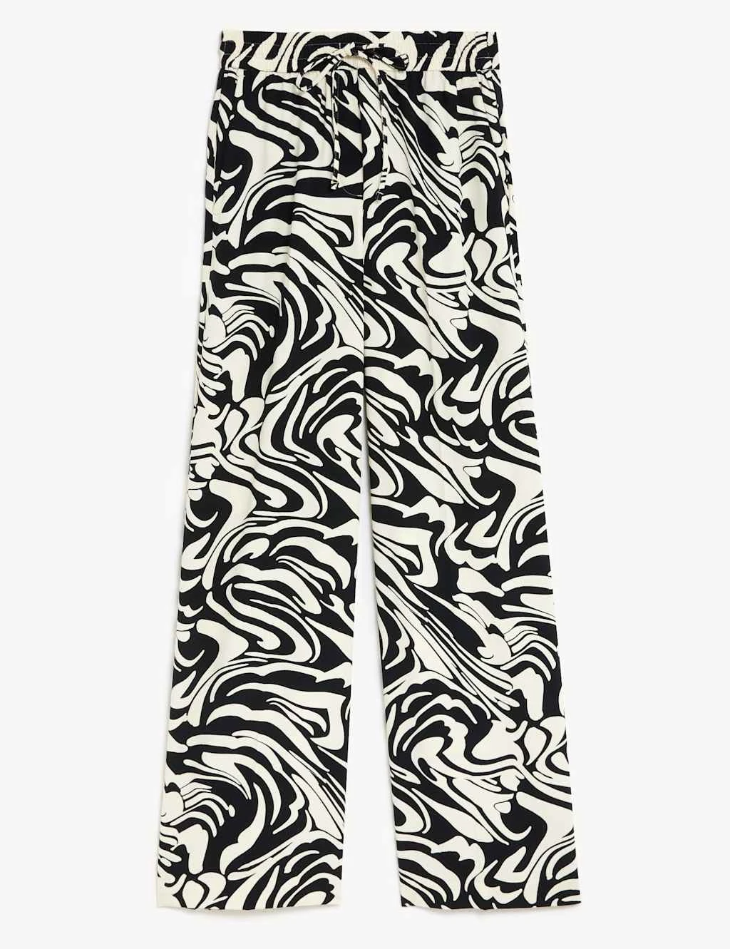 With their bold print, these wide leg trousers will be a standout element of your outfit. Designed with full-length legs and a flattering high-rise waist. Drawstring ties allow you to adjust the elasticated waistband for comfort. Two practical side pockets, plus mock pockets at the back for a polished look.