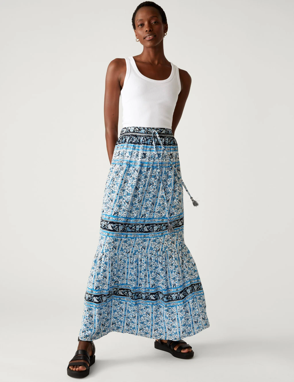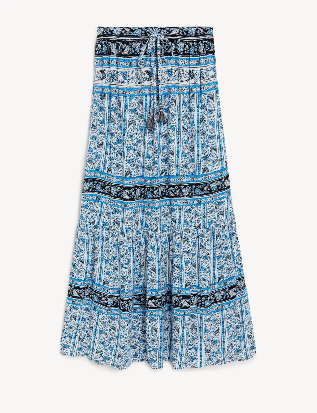 Float through warm weather in style with this tiered maxi skirt. It’s cut to an easy regular fit, with a comfy elasticated waist that can be adjusted with tasselled ties. The piece features a boho-inspired tile design decorated with delicate florals for added charm.