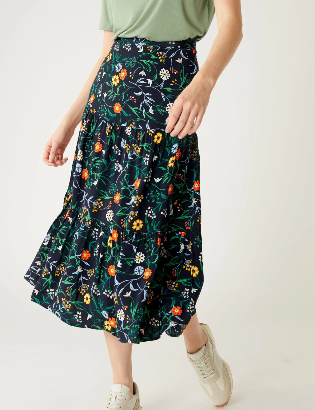 A bold print gives this light and drapey skirt an eye-catching look. It’s designed with three gathered tiers, finishing at a versatile midaxi length. The fitted waistband fastens discreetly with a zip.