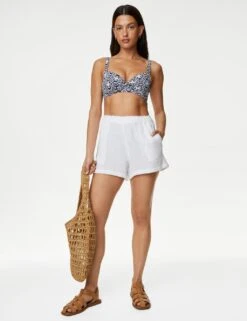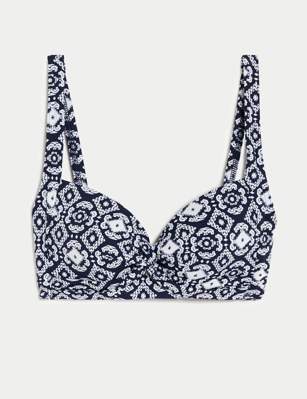 Feel fabulous on your next swim in this printed bikini top. It has a regular fit with padded cups and adjustable straps for comfort. A clasp fastening at the back creates a secure feel, while a plunging v-neck offers a feminine shape. Stretchy fabric features Sun Smart UPF50+ technology to help protect against harmful UV rays.