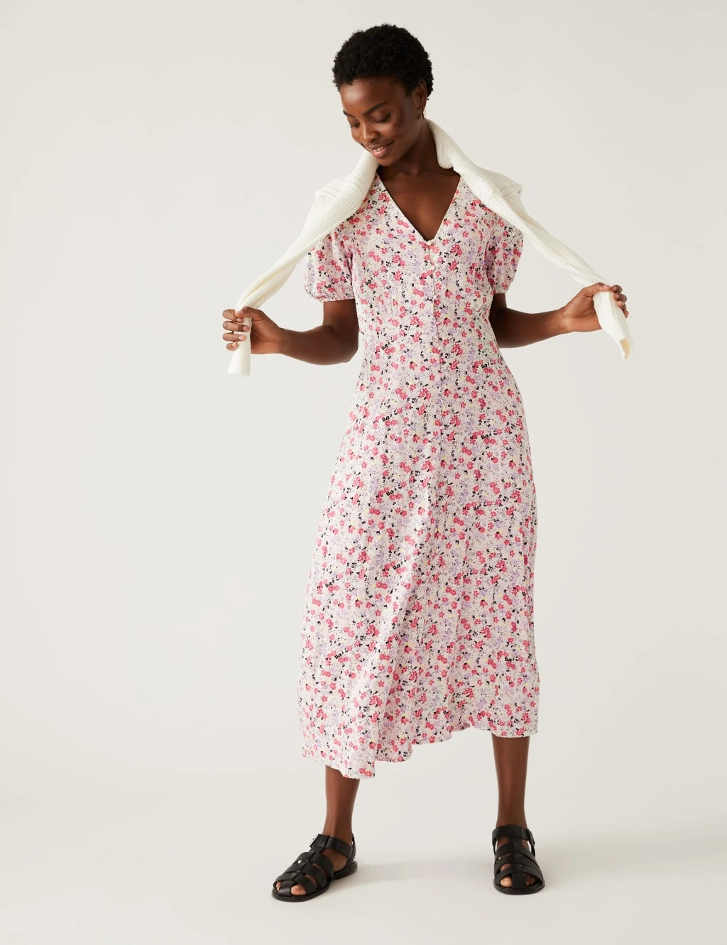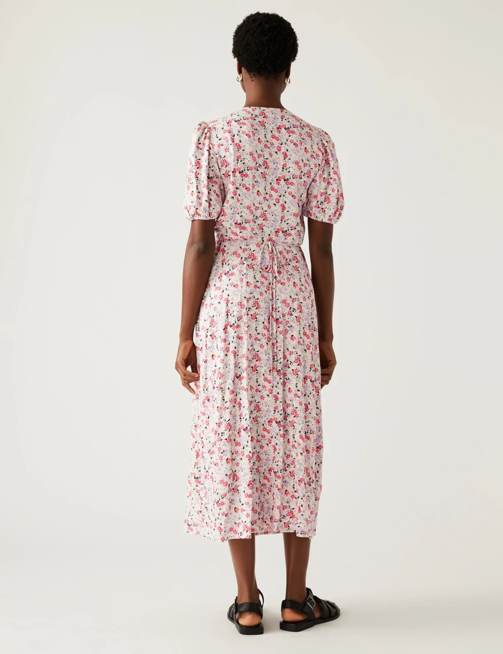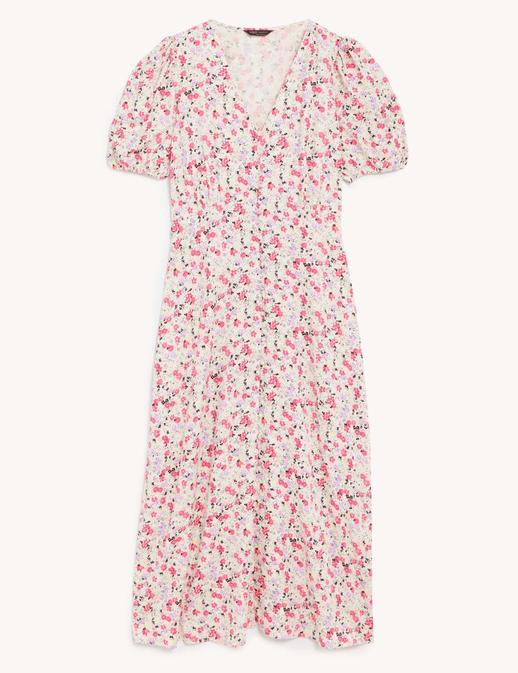 The striking print of this stylish midi tea dress creates a timeless wardrobe addition. The v-neck style is cut in an easy regular fit and fastens with an elegant row of covered buttons. Delicate under-bust gathering and puffed short sleeves complete the flattering silhouette.