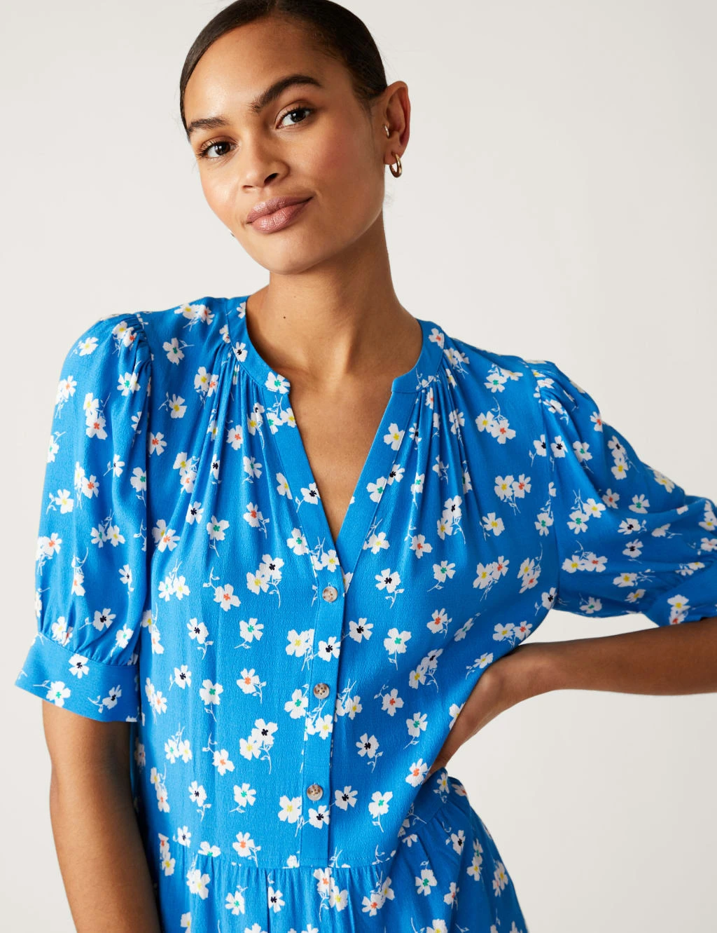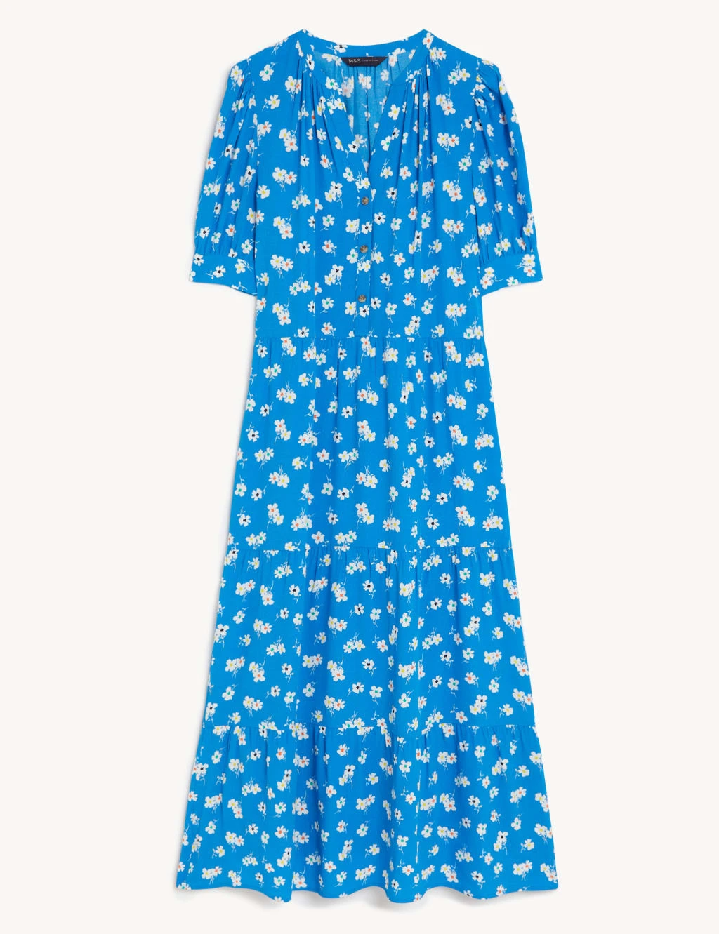 Swish into warmer weather with this midi dress. It’s designed in a comfy regular fit, with tiers on the skirt for subtle shaping. You’ll find a functional button-down fastening beneath the elegant v-neckline. Short puff sleeves add a touch of volume, while a popping print creates a standout look.