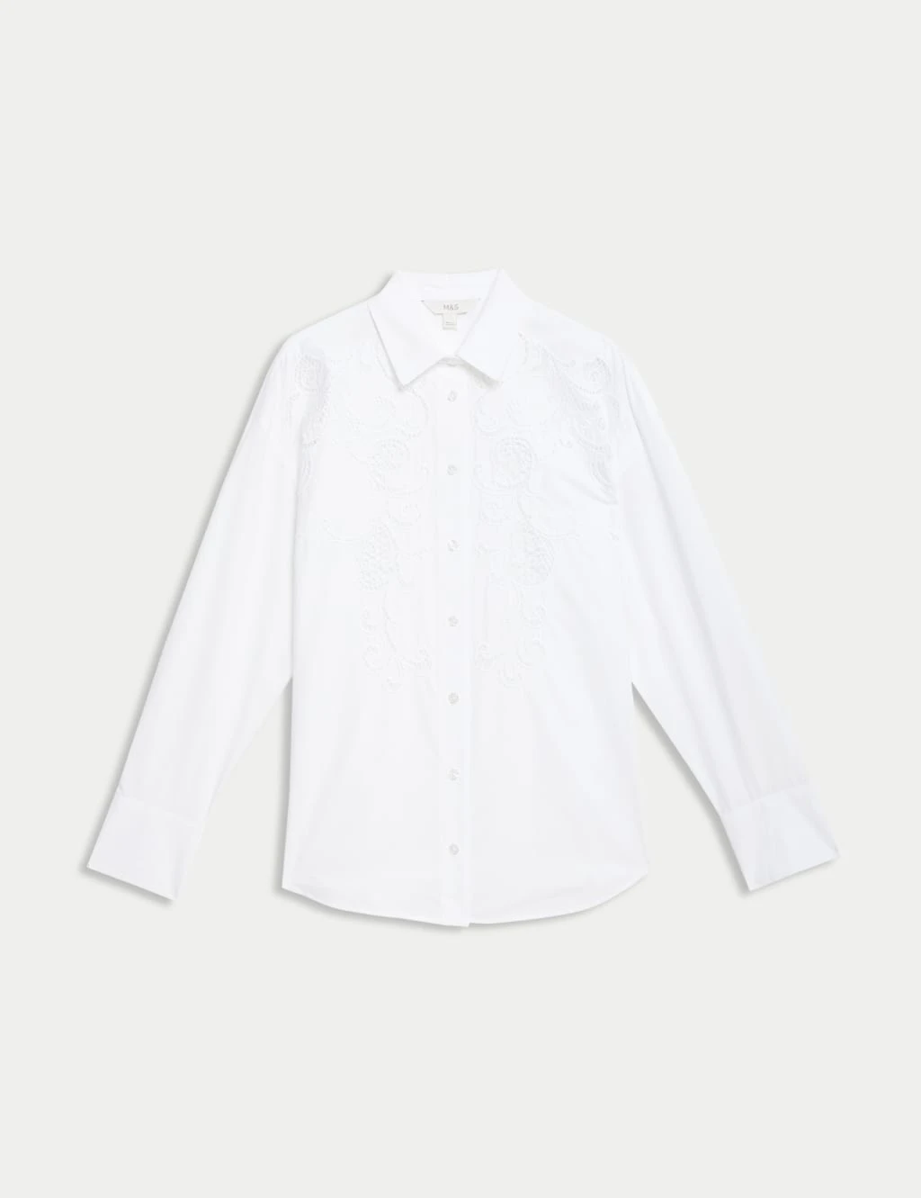 This pure cotton shirt features broderie cutwork detailing for a charming look. It’s made in a comfy regular fit, with a neat button-through fastening. The collared neckline and long cuffed sleeves create a smart silhouette, while a curved hem completes the design. M&S Collection: easy-to-wear wardrobe staples that combine classic and contemporary styles.