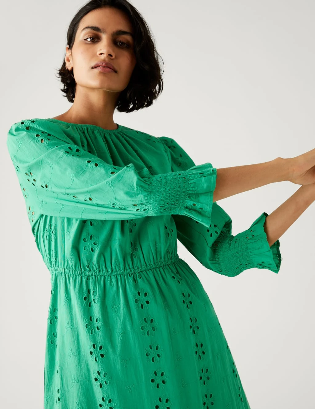 Your outfit will speak for itself when you wear this pure cotton broderie dress. The regular-fitting piece features a round neck and an elasticated waistband that flatters your figure. Voluminous long sleeves with shirred cuffs and a tie at the back of the neck add feminine touches, while the midi-length, tiered skirt shapes an elegant silhouette.