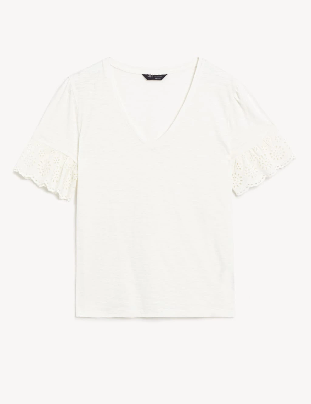 This pure cotton embroidered top has an instantly summery feel. Regular fit, with a flattering v-neck. Broderie detail on the sleeve cuffs for added femininity.