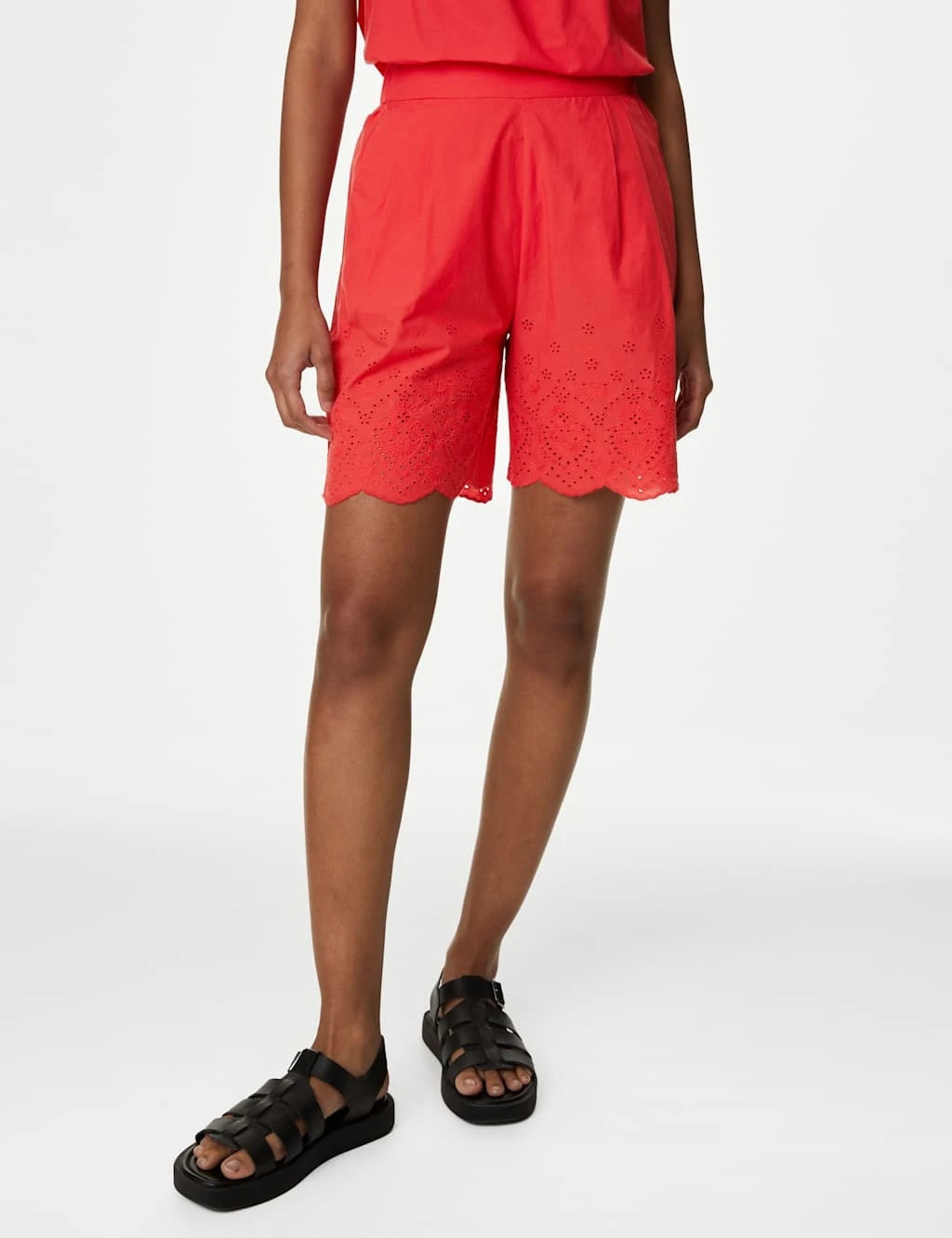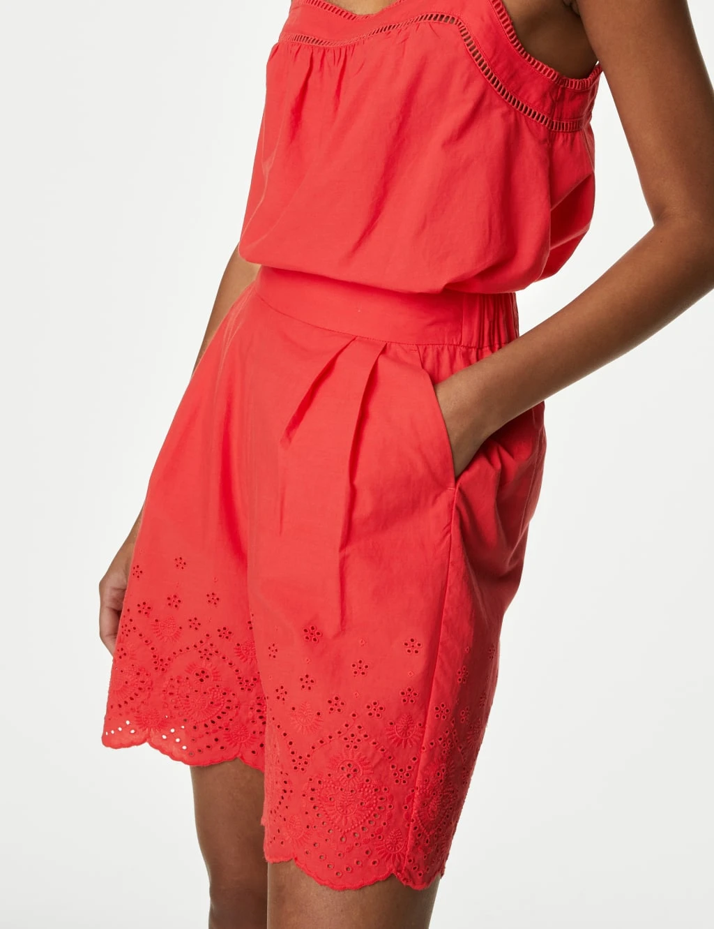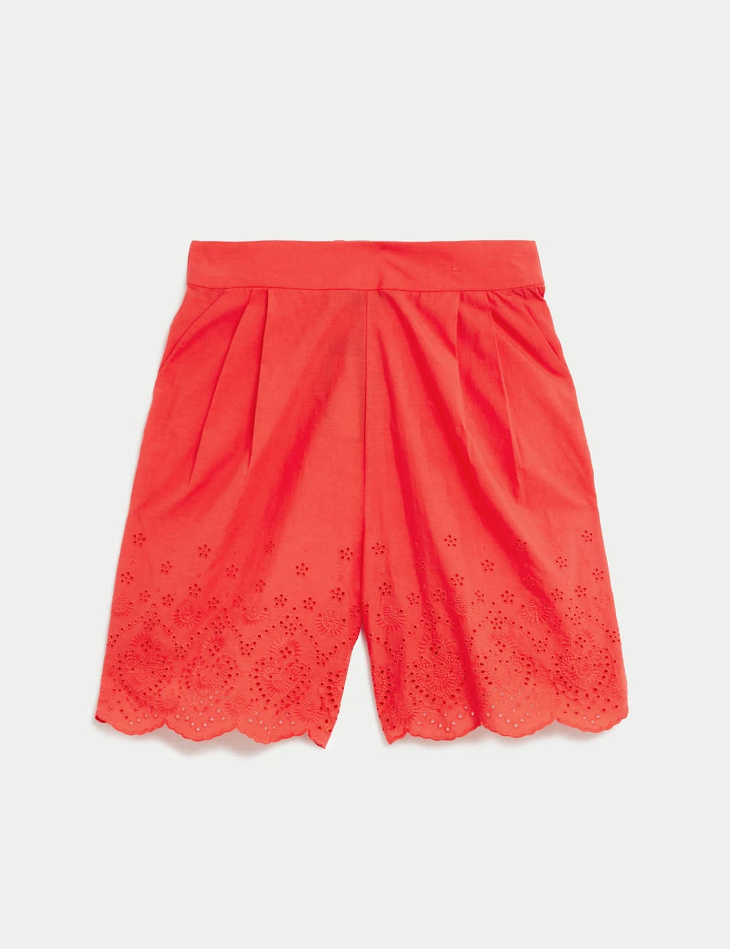 Crafted from breathable pure cotton, these shorts will add something special to your casual outfits. Cut to a comfortable regular fit with an elasticated high waist. The pleated detail at the front gives this style a tailored feel, while a scalloped hem and embroidered pattern create a feminine finish.