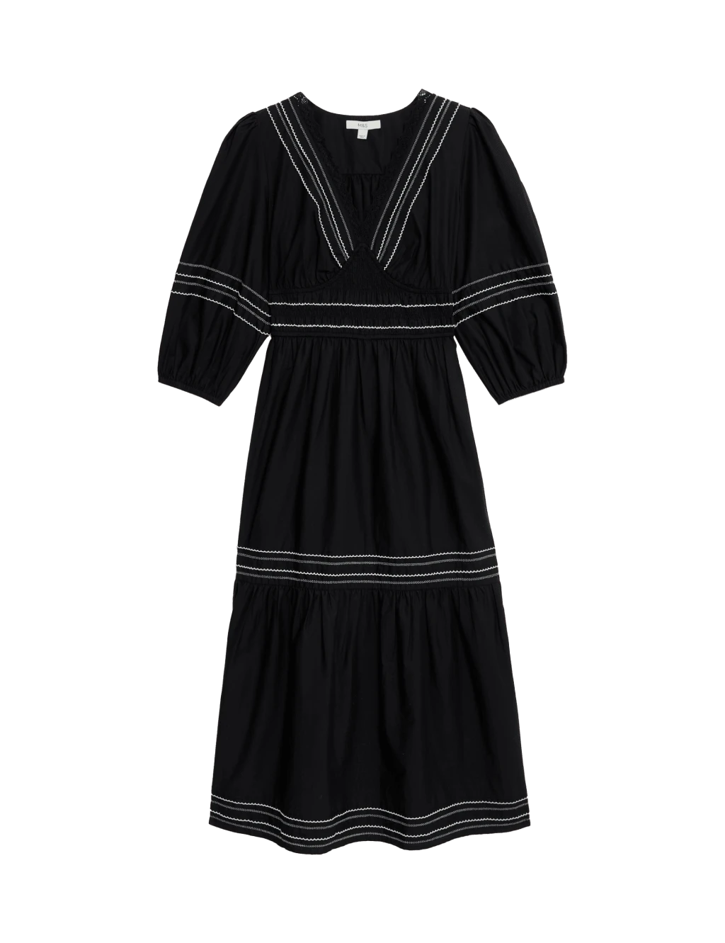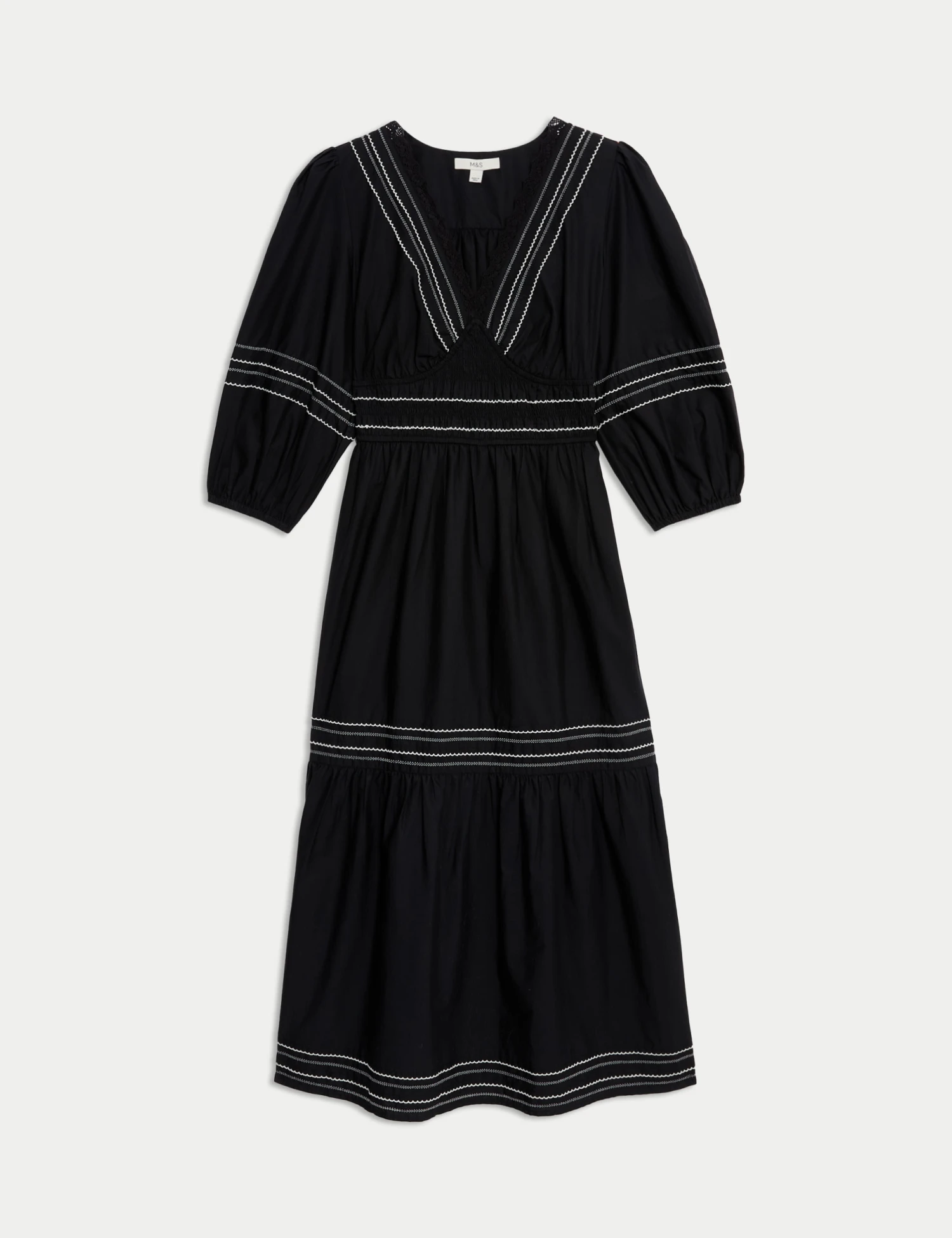This pure cotton waisted dress is a charming choice for warmer days. The midi-length design is cut in a regular fit, with a flattering v-neckline and airy three-quarter-length sleeves. Embroidered detailing and lace trims add a pretty finish. M&S Collection: easy-to-wear wardrobe staples that combine classic and contemporary styles.