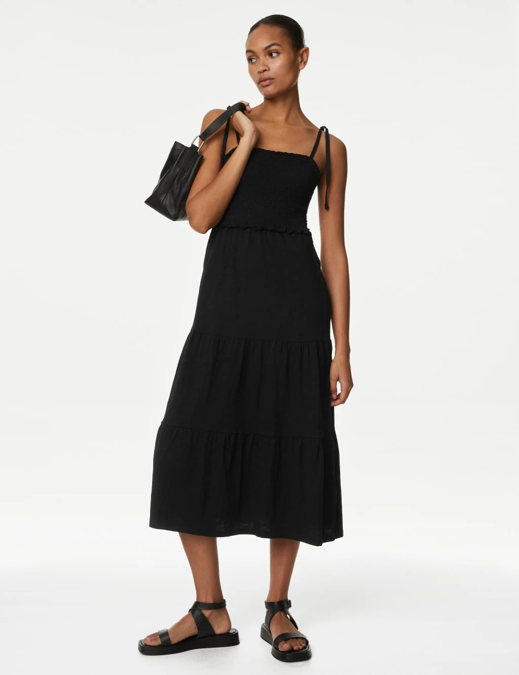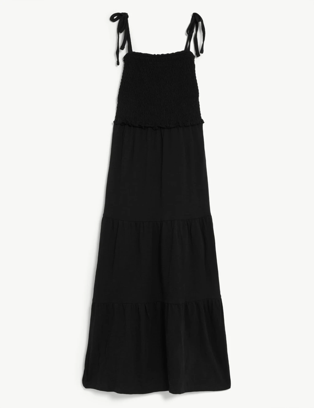 If you’re looking for an easy warm-weather style, this pure cotton jersey dress delivers. It’s designed in a regular fit, with a square neckline and tie detail on the straps for extra sunny-day appeal. The shirred bodice offers flattering shaping, while tiers on the midi-length skirt add swishy movement.