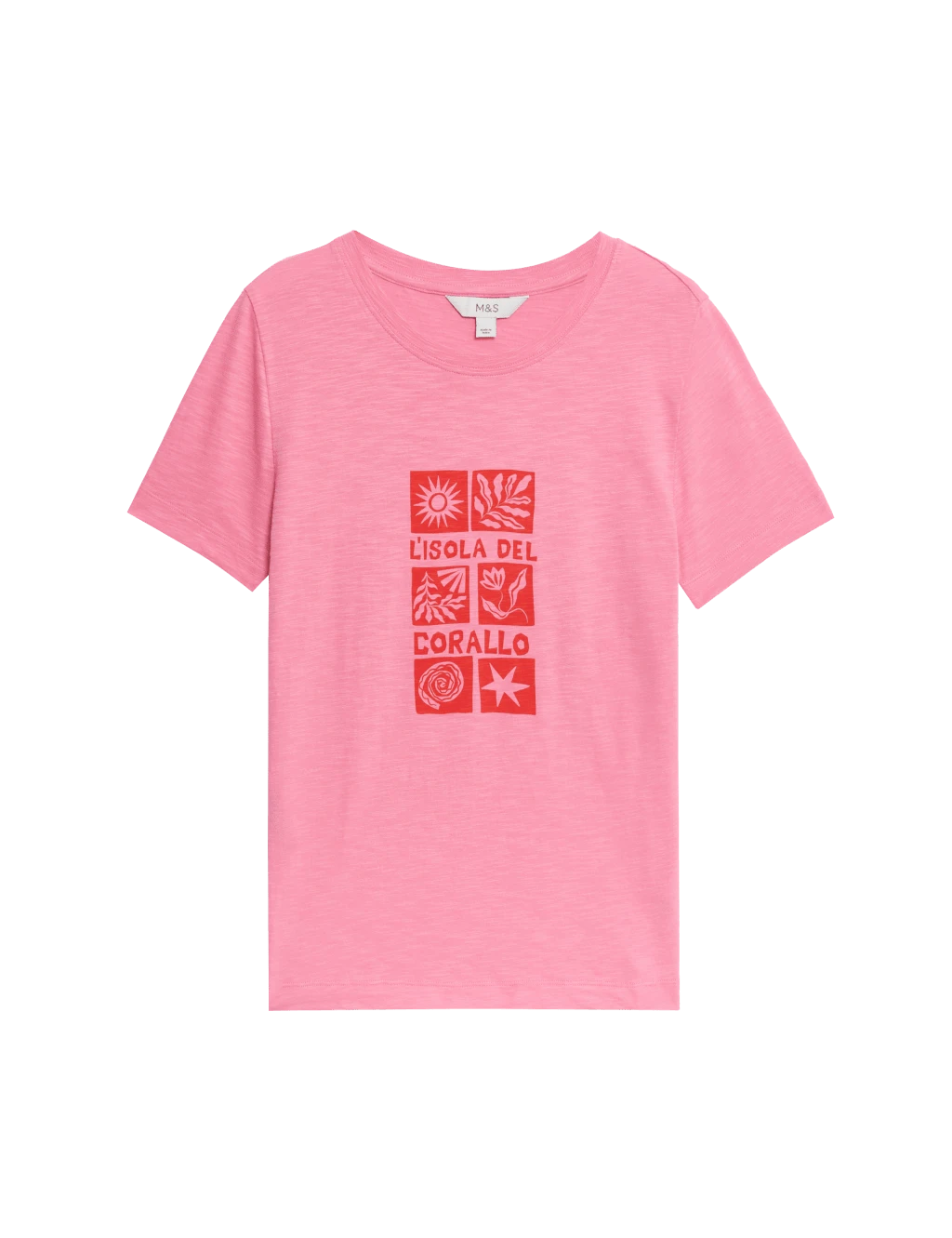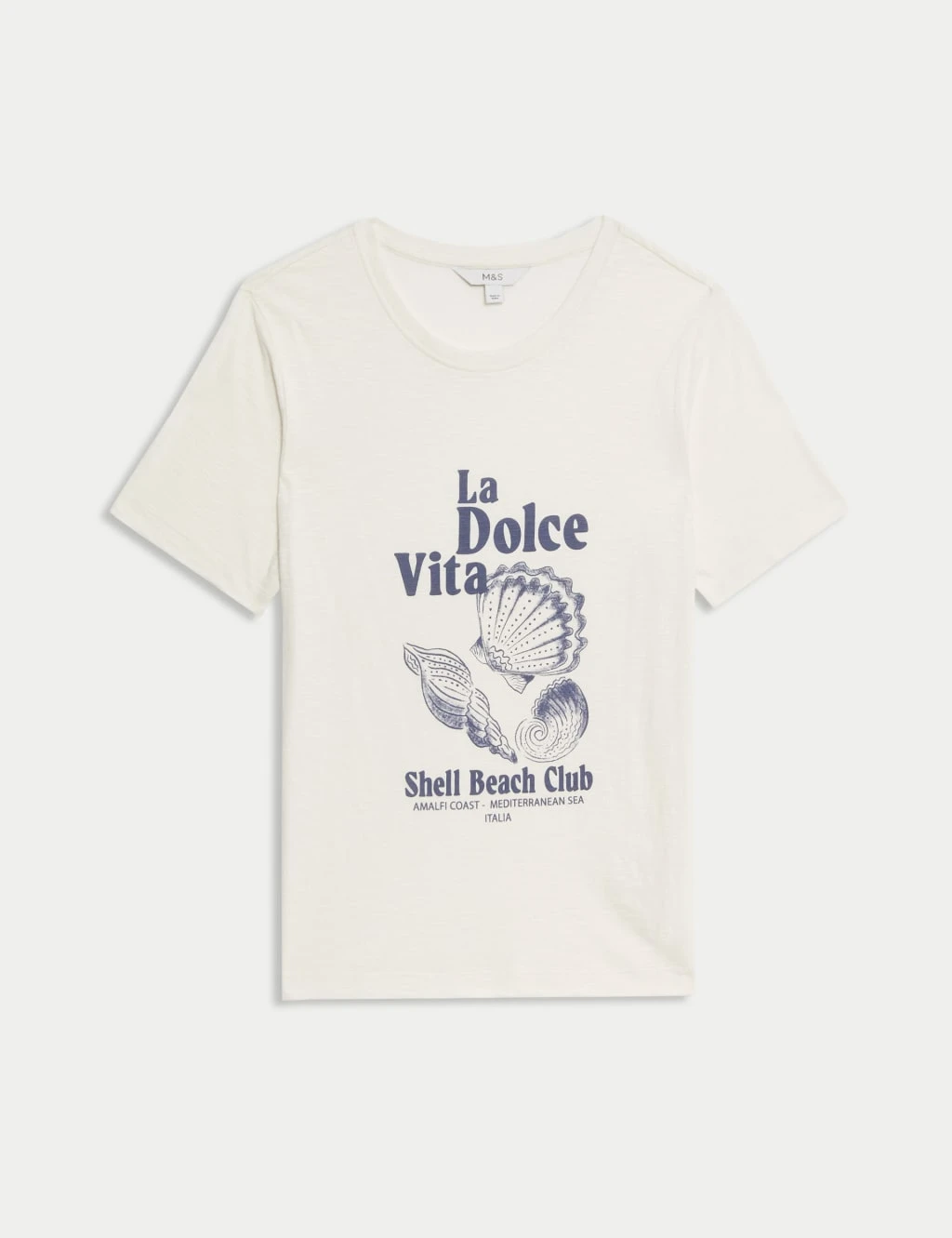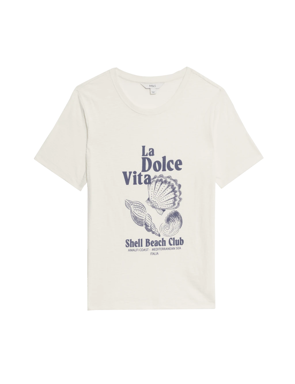 Prepare for a sweet life in this pure cotton t-shirt, with its playful graphic design. Regular fit, with a neat crew neckline. On the front are shells and the words “La Dolce Vita: Shell Beach Club”, for a holidayish feel. M&S Collection: easy-to-wear wardrobe staples that combine classic and contemporary styles.