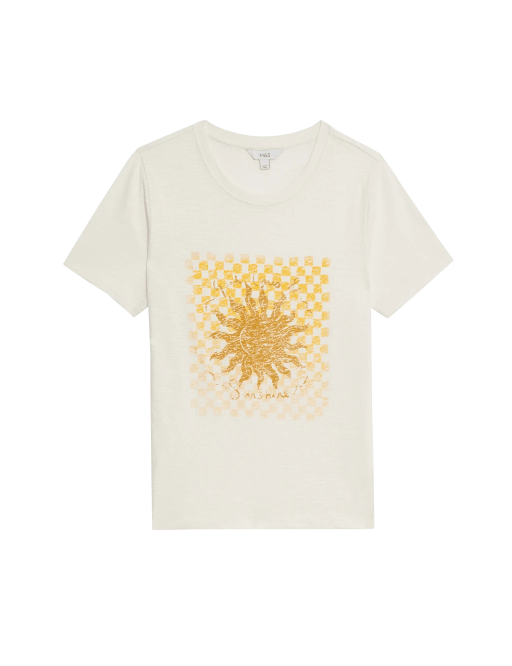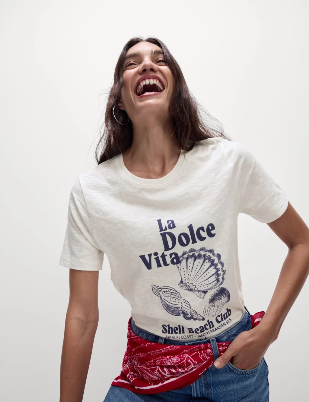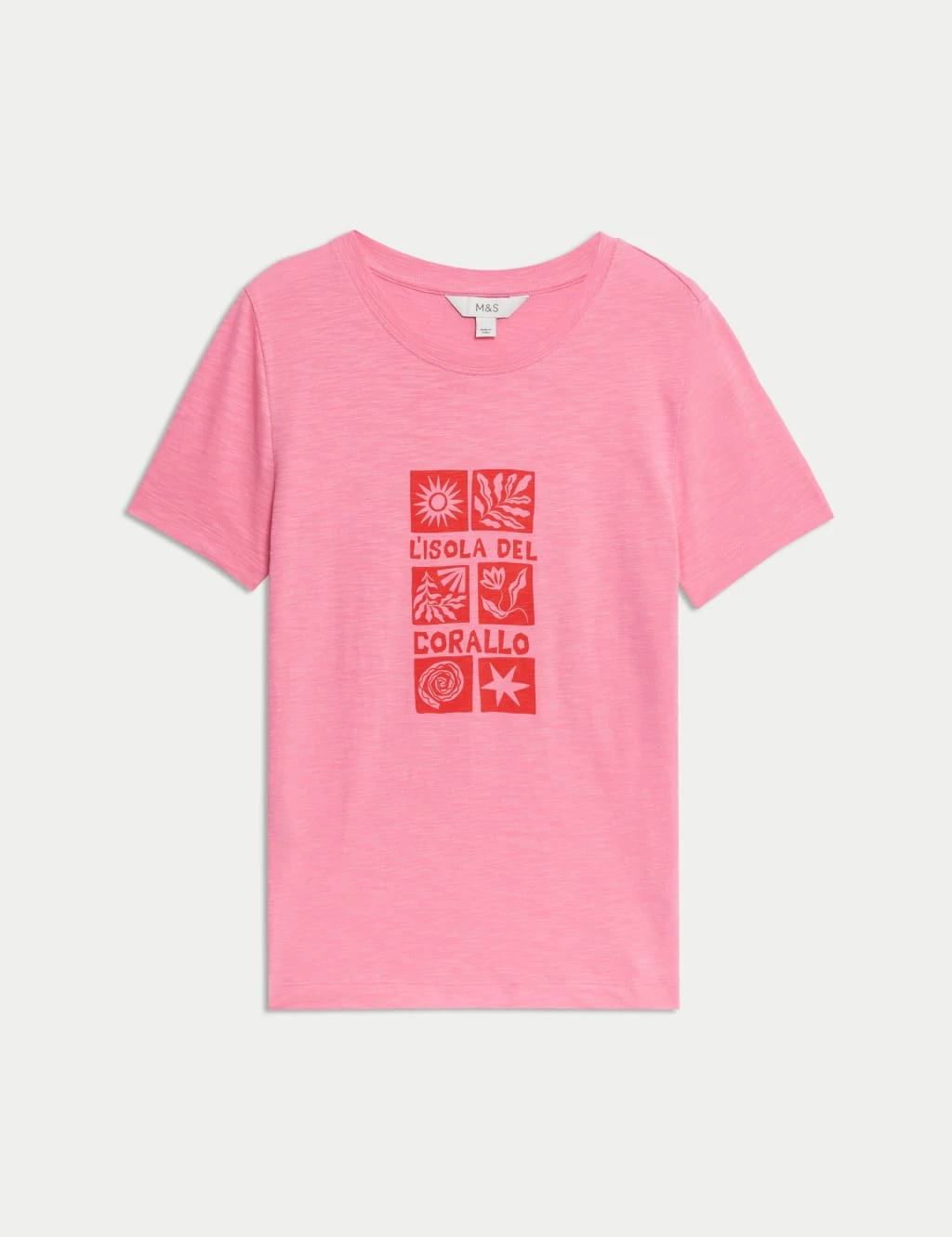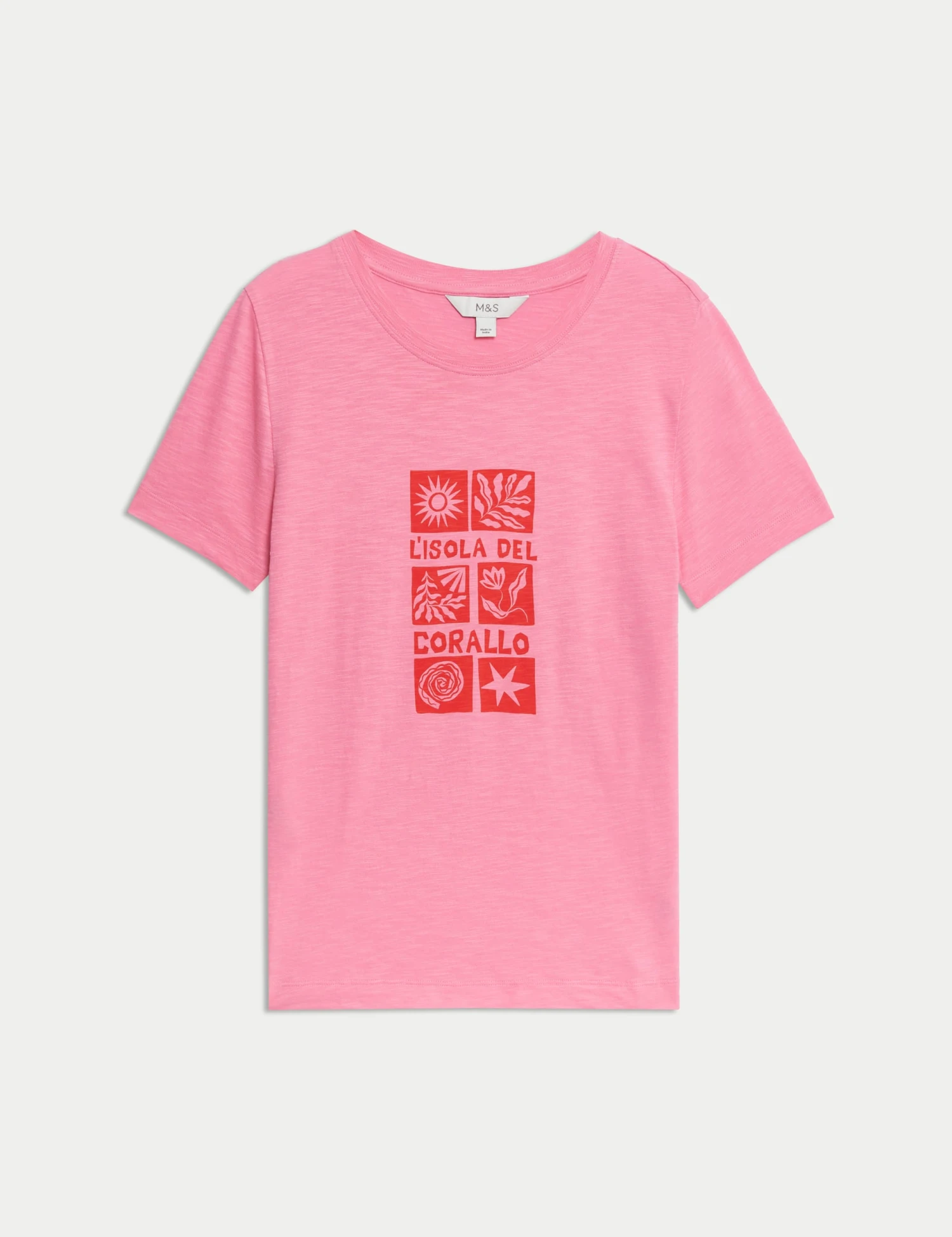Prepare for a sweet life in this pure cotton t-shirt, with its playful graphic design. Regular fit, with a neat crew neckline. On the front are shells and the words “La Dolce Vita: Shell Beach Club”, for a holidayish feel. M&S Collection: easy-to-wear wardrobe staples that combine classic and contemporary styles.