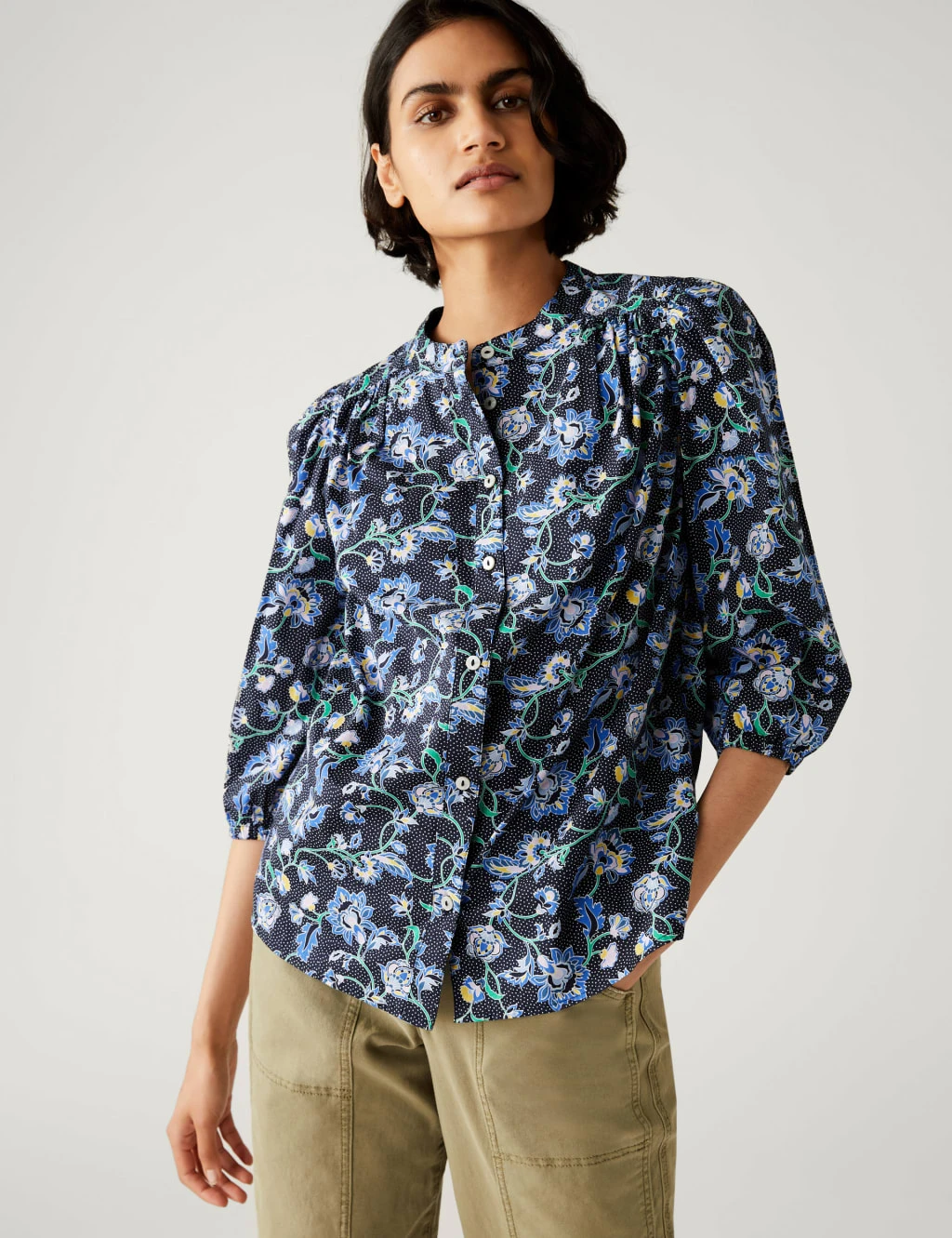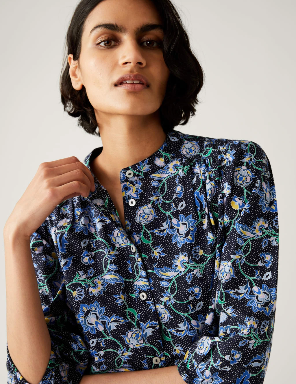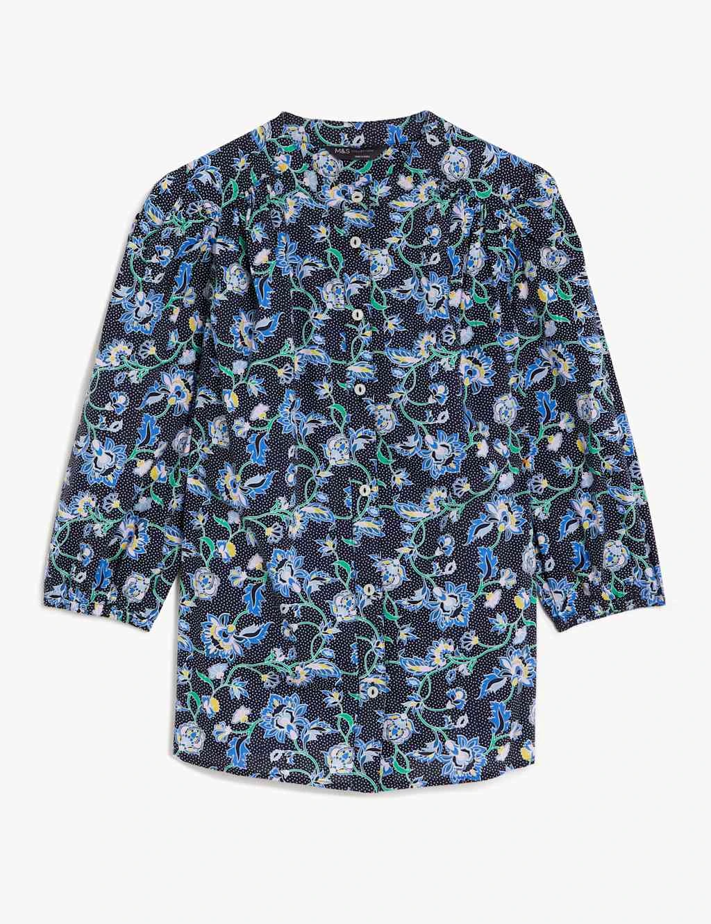 This printed blouse is crafted from pure cotton for a comfortable feel. It’s designed in a regular fit, with gathers at the shoulders for a looser feel. The 3/4 length sleeves finish in elasticated cuffs for a touch of volume. Complete with a high neckline and button fastening at the front. M&S Collection: easy-to-wear wardrobe staples that combine classic and contemporary styles.