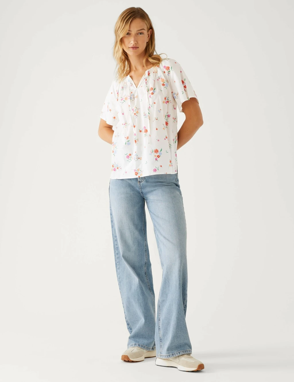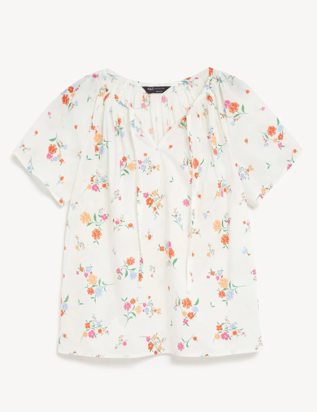 The floaty silhouette and pretty print make this pure cotton blouse perfect for the warmer months. Cut in a regular fit with a high crew neckline that fastens with a tie. Loose-fitting short sleeves without cuffs give a breezy feel.