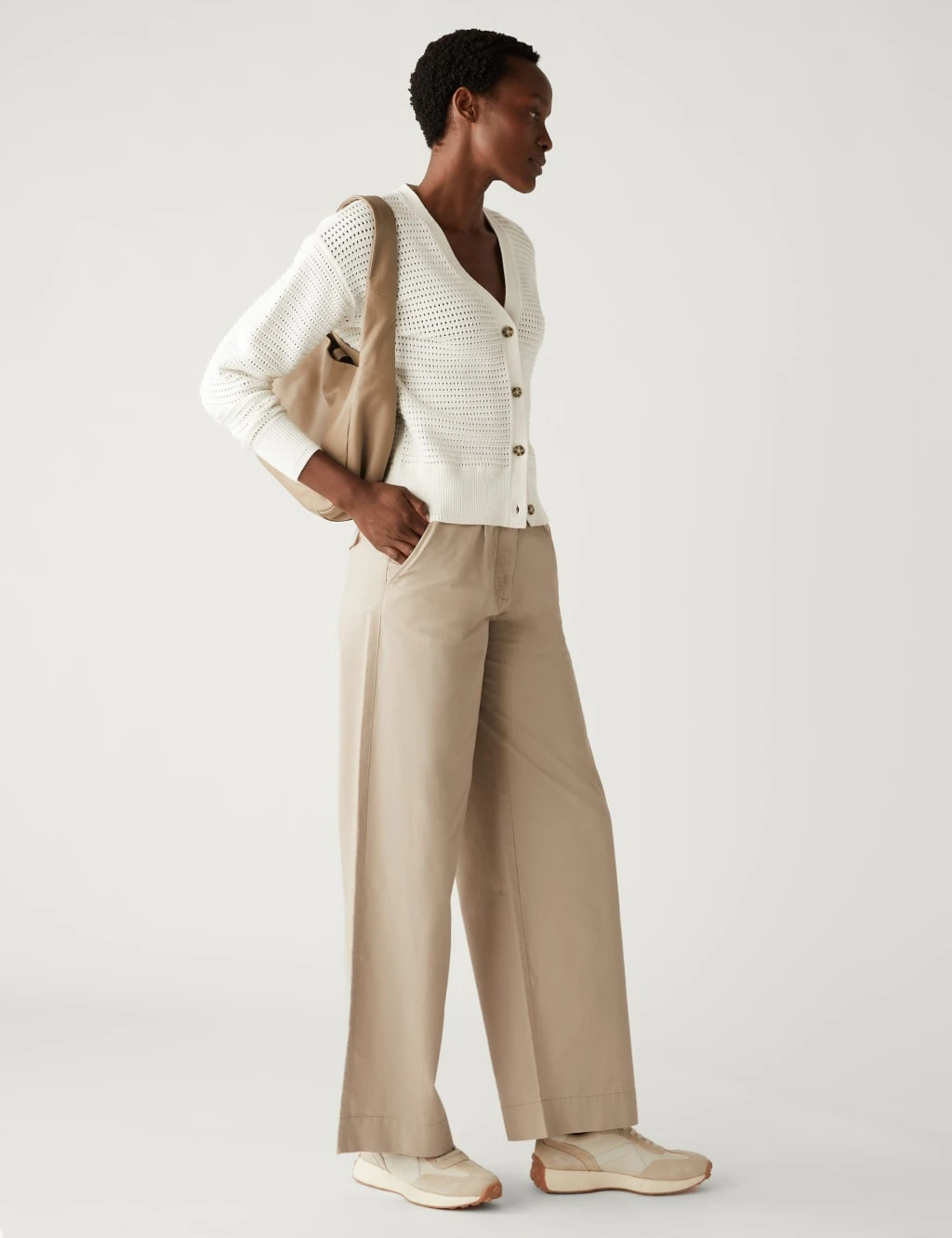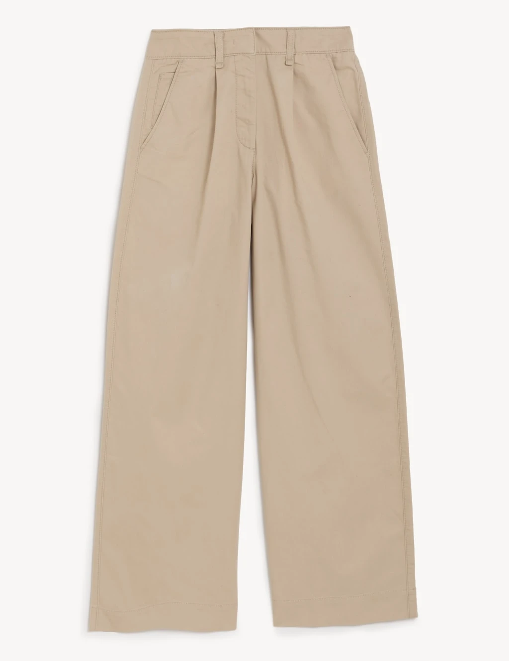 Elevate your casual style with these pure cotton chinos. They’re cut wide through the leg for an effortless slouchy look and have a flattering high waist with a neat hook bar and zip fastening. Pleats down the centre front add extra shaping. Belt loops and handy side seam pockets bring a classic finish.