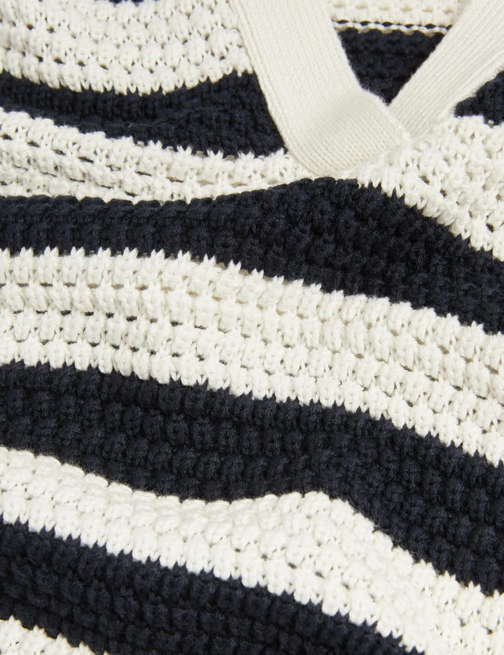 Bold stripes lend a nautical feel to this pure cotton knitted top. It’s made to an easy relaxed fit, with a neat collar and an open v-neck. The breezy short sleeves and crochet texture add to the maritime vibe. Tipping at the cuffs and hem delivers a smart finish. M&S Collection: easy-to-wear wardrobe staples that combine classic and contemporary styles.
