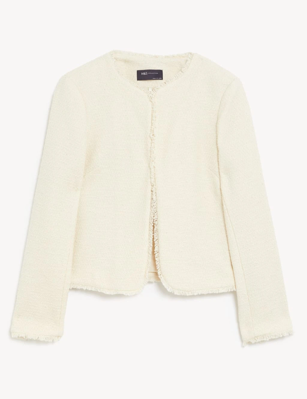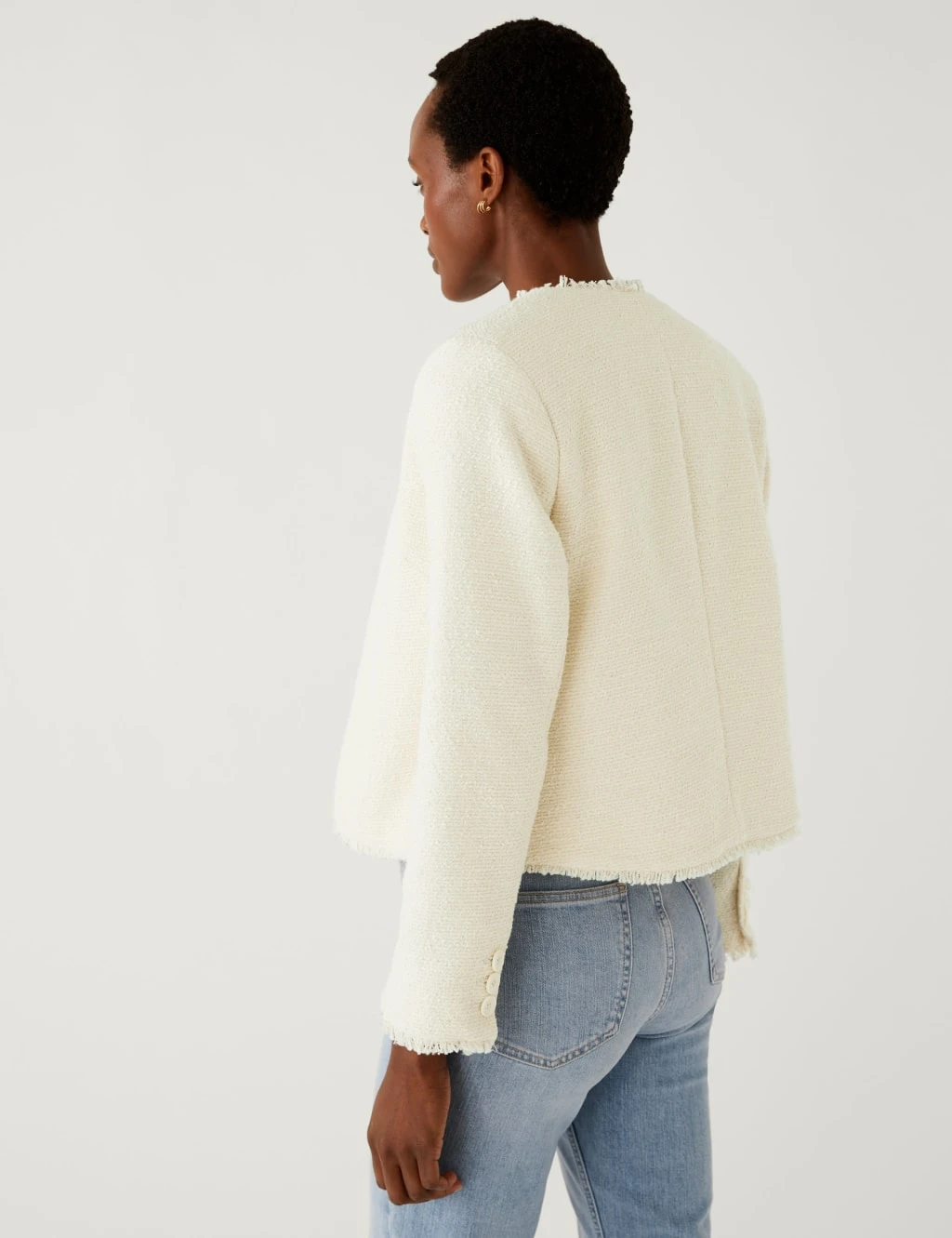 Cut an elegant silhouette in this pure cotton tweed jacket. Designed in a straight fit that falls to a sophisticated shorter length. Featuring discreet hook and eye fastenings. A collarless round neck adds luxury appeal.