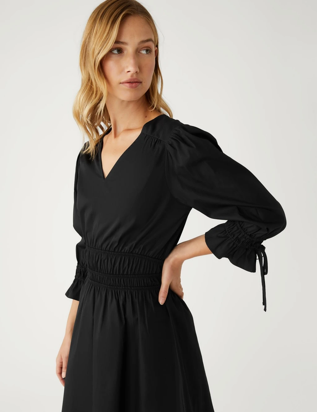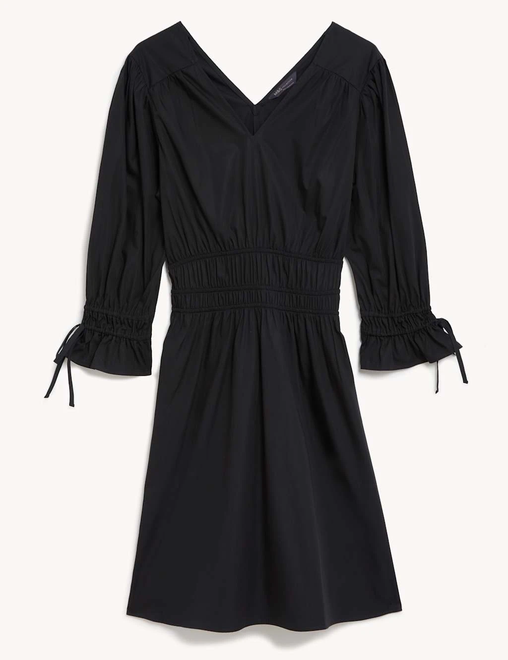 Flaring out at the hem for a feminine silhouette, this dress is an extra stylish addition for your wardrobe. Cut in a regular fit, it falls to a fun mini length with an elasticated waist to emphasise your figure. The cotton poplin style is framed by a flattering v-neck and back and finished with three-quarter sleeves that tie at the cuff for extra volume.
