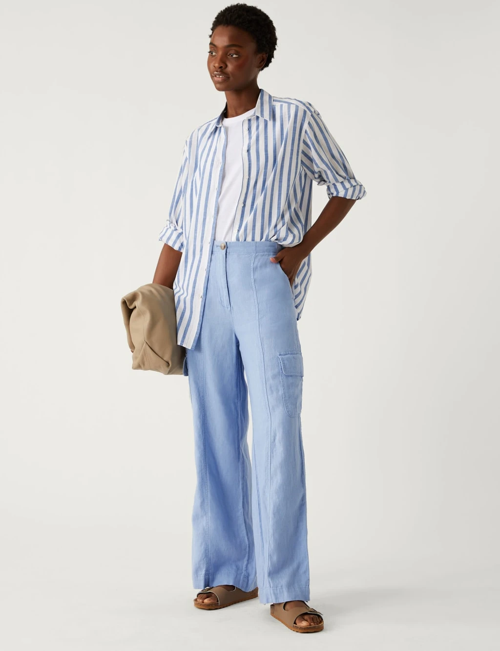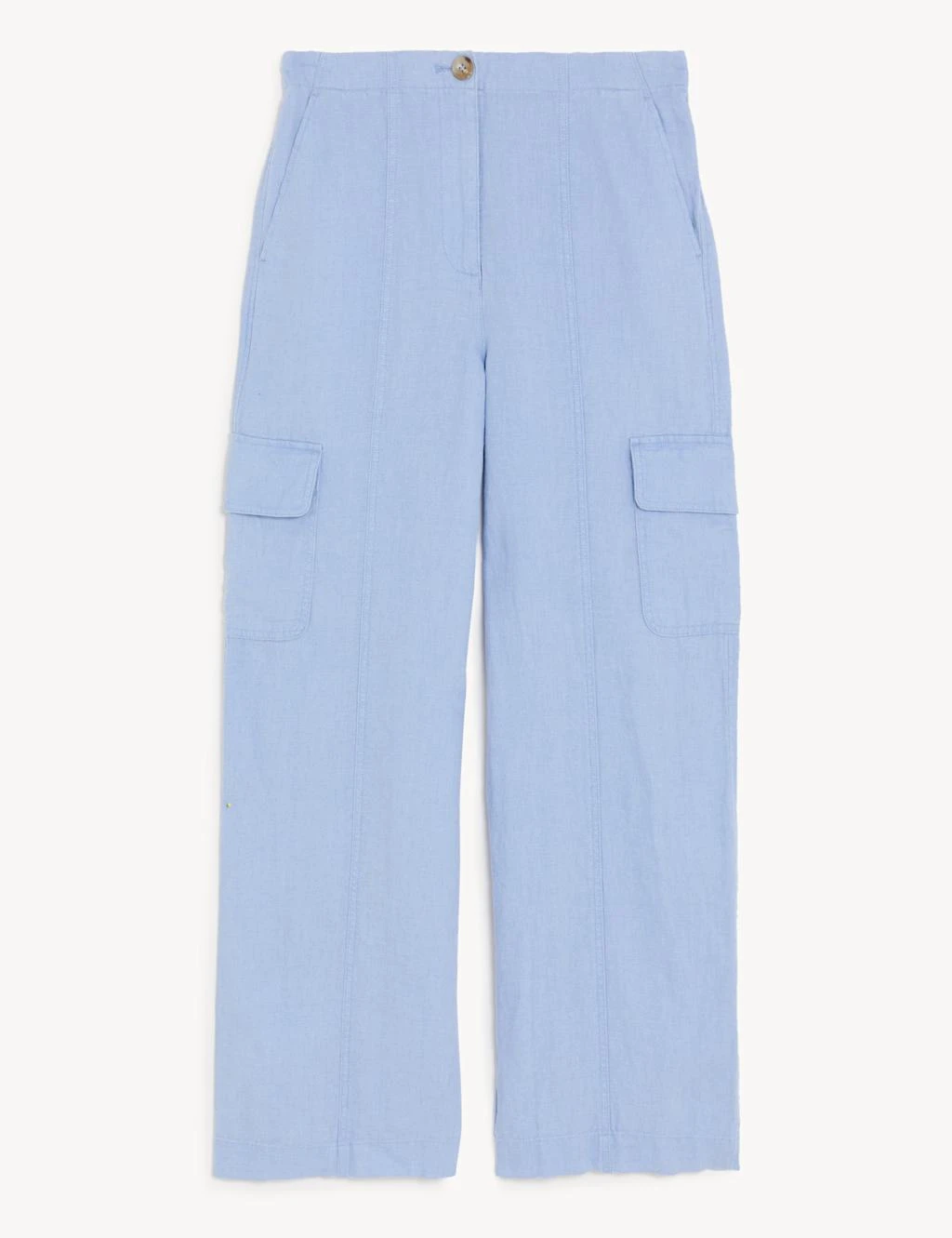 These utility trousers blend on-trend cargo styling with breezy pure linen. Wide leg shape, with a smart button and zip fastening. The mid-rise waist is elasticated at the back for comfort. Stitched seams down the centre front and pockets at the back and on the outer leg add to the utility-inspired look.
