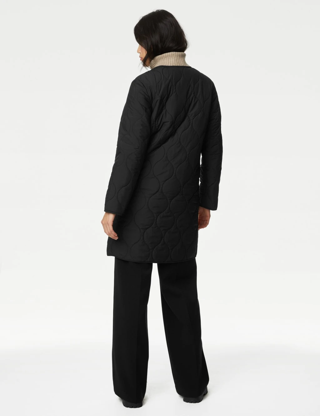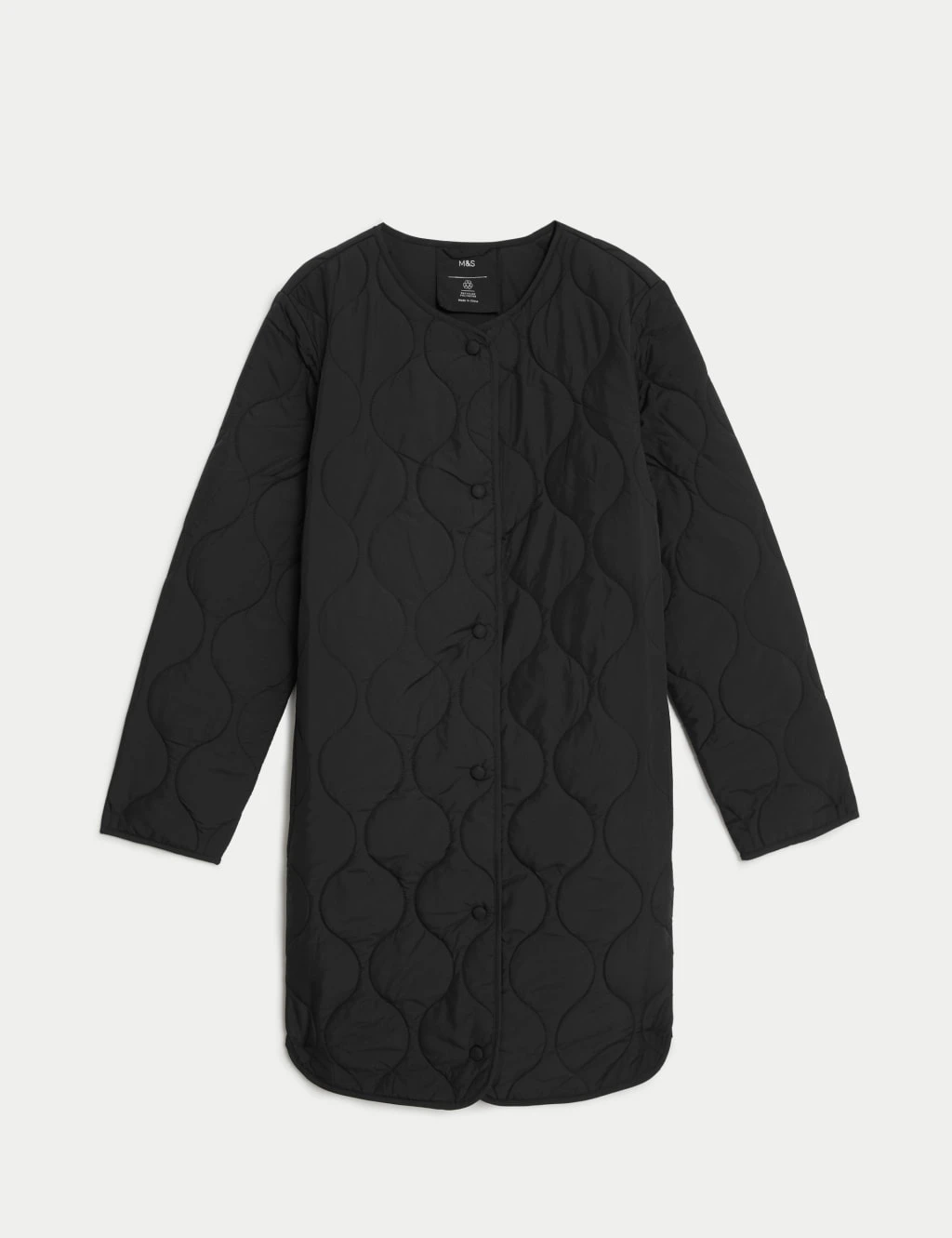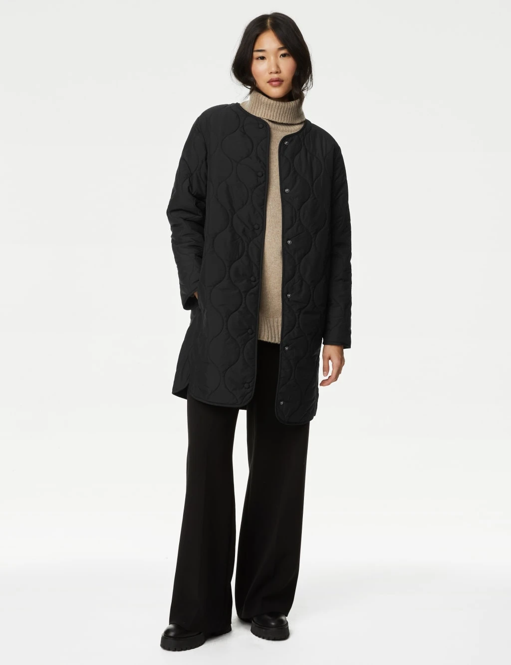 This lightweight puffer jacket can be worn as an outer layer on warmer days or layered beneath another piece when the weather turns chilly. It’s cut in a comfy regular fit with a neat collarless neckline and easy popper fastening. A jar quilting pattern gives textural interest, while two side pockets offer handy storage. Plus, there’s clever water-repellent Stormwear™ technology to help you stay dry in a shower.