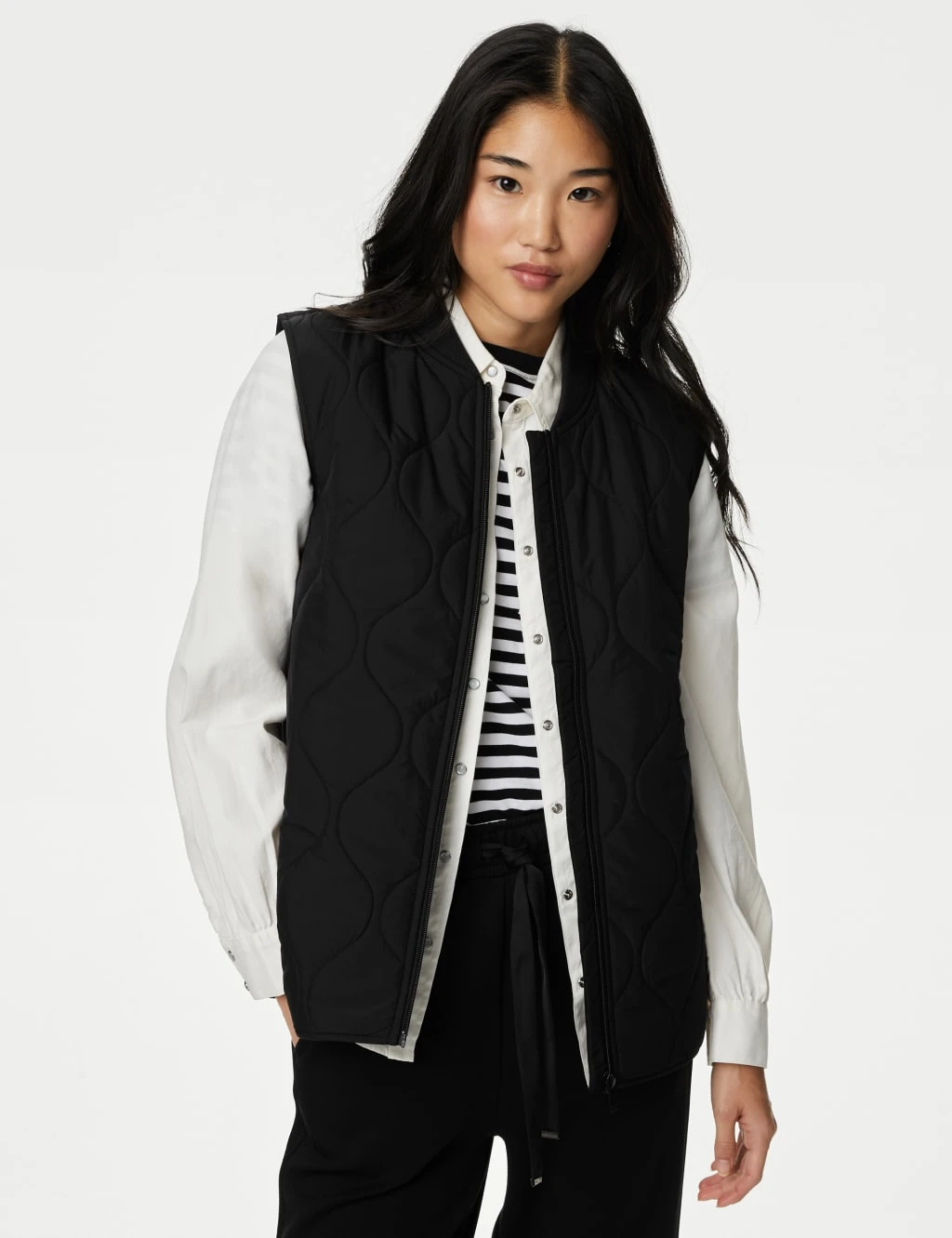 Layer up with this lightweight quilted gilet. This versatile style is cut in a regular fit, with a secure zip-front fastening as well as internal pockets. It features clever water-repellent Stormwear™ technology and added stretch for comfort. The Thermowarmth™ technology and ribbed neck give you extra warmth. Plus, it’s lined and has curved vents at the hem to offer flattering shaping. Made with recycled polyester.