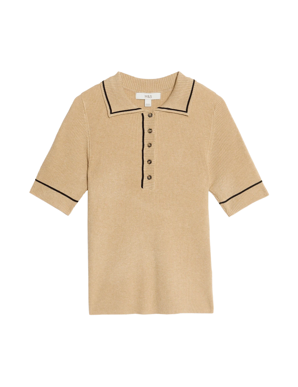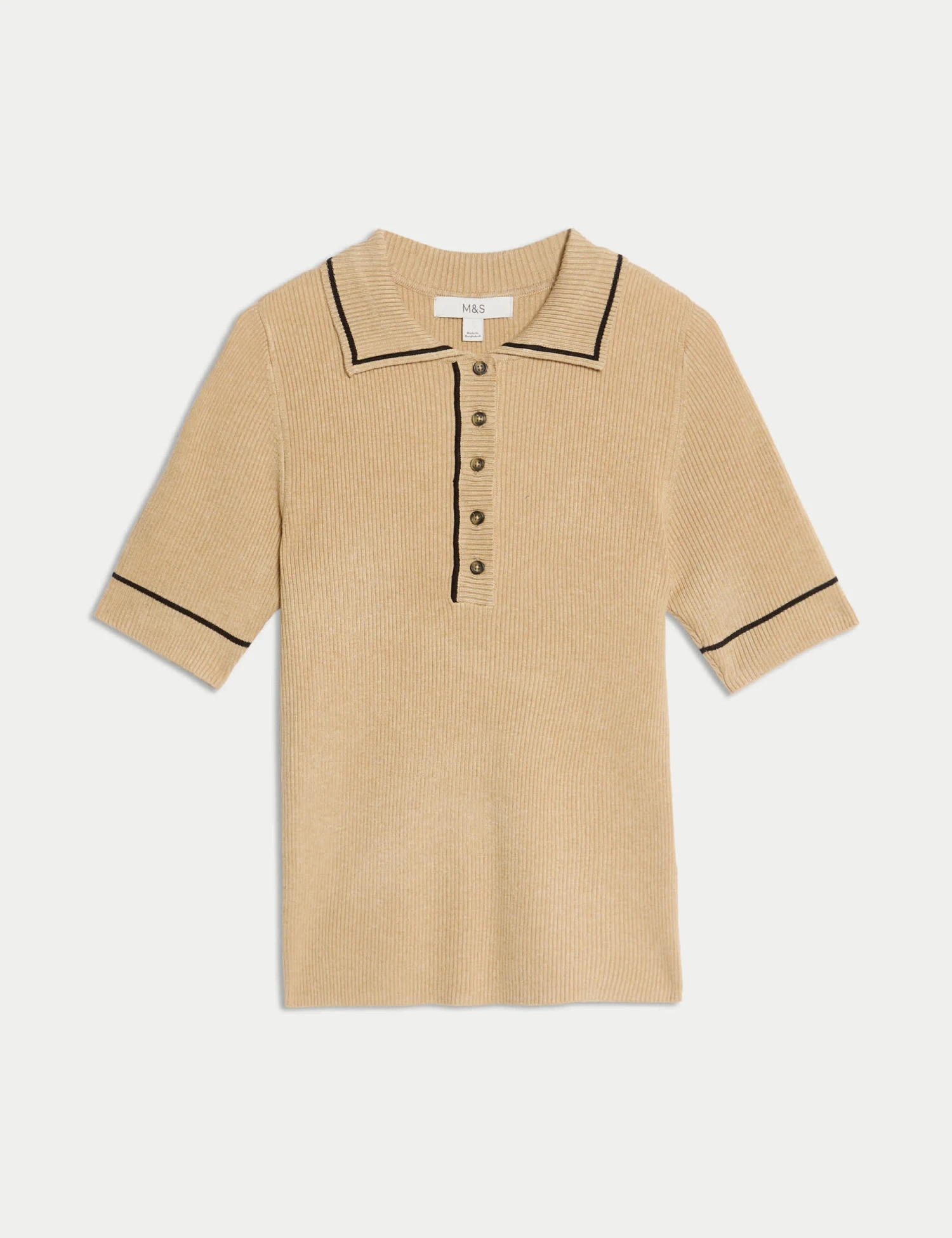 This knitted top is a sophisticated choice for your smart-casual collection. It comes in a flattering slim fit, featuring a collared neckline that fastens with five contrasting buttons to create a neat effect. The short sleeves provide an airy feel, while tipped detailing and an all-over ribbed texture add the finishing touch. M&S Collection: easy-to-wear wardrobe staples that combine classic and contemporary styles.