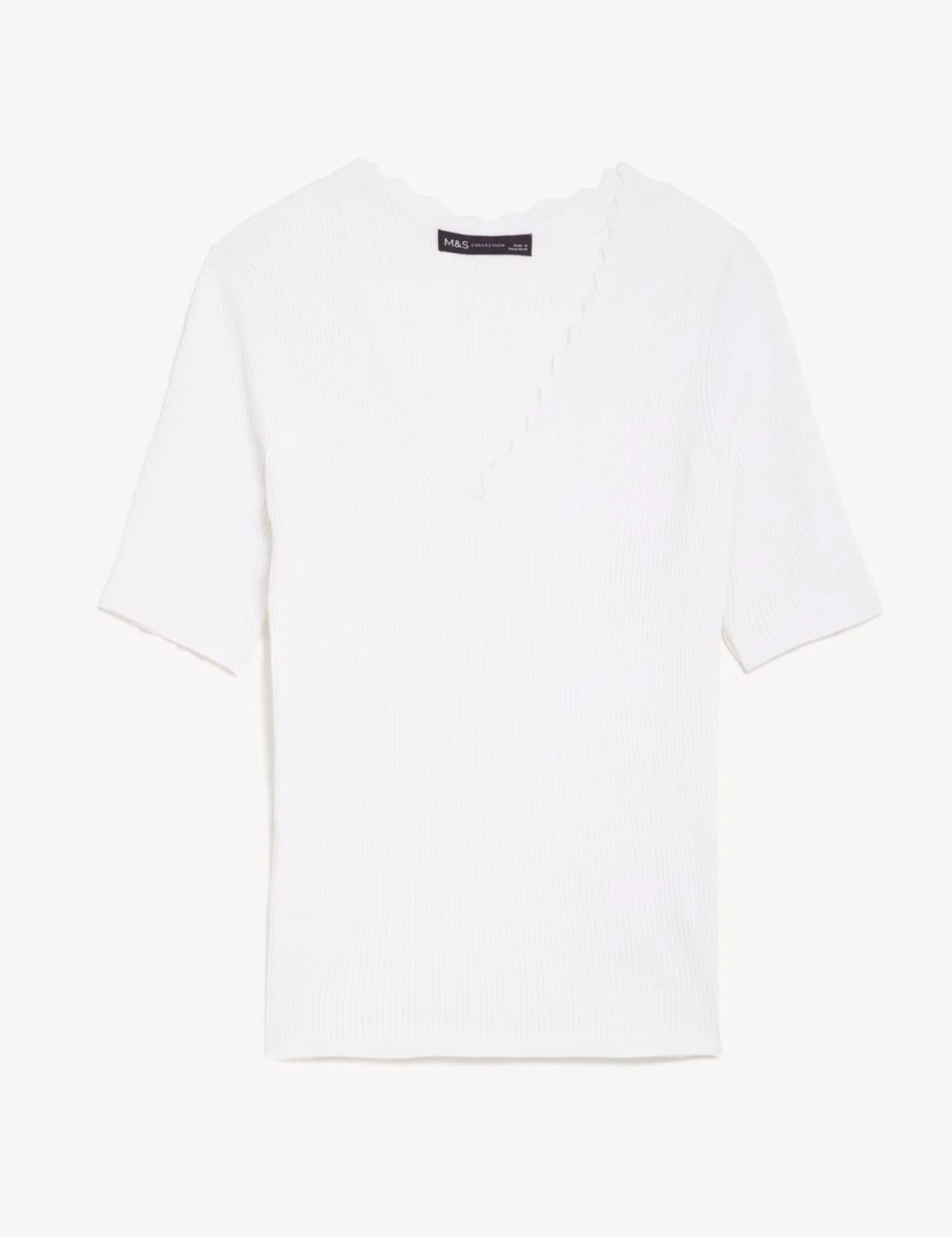 This knitted top features an elegant scalloped trim around the v-neckline for a premium look. It’s cut to a flattering regular fit, with short sleeves for a casual feel. The ribbed yarn provides a subtly textured finish. M&S Collection: easy-to-wear wardrobe staples that combine classic and contemporary styles.