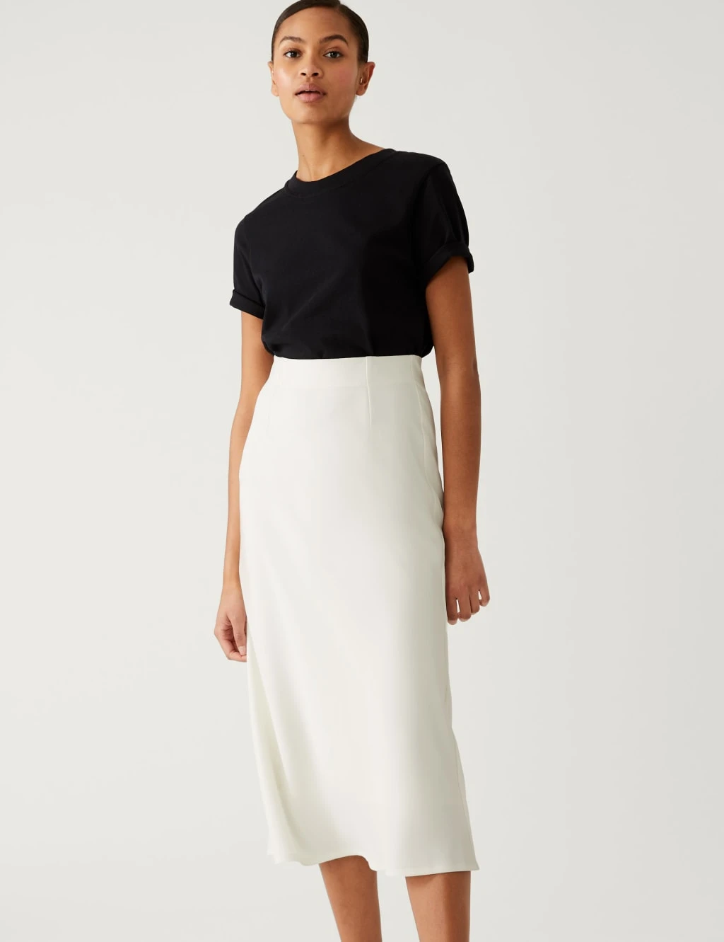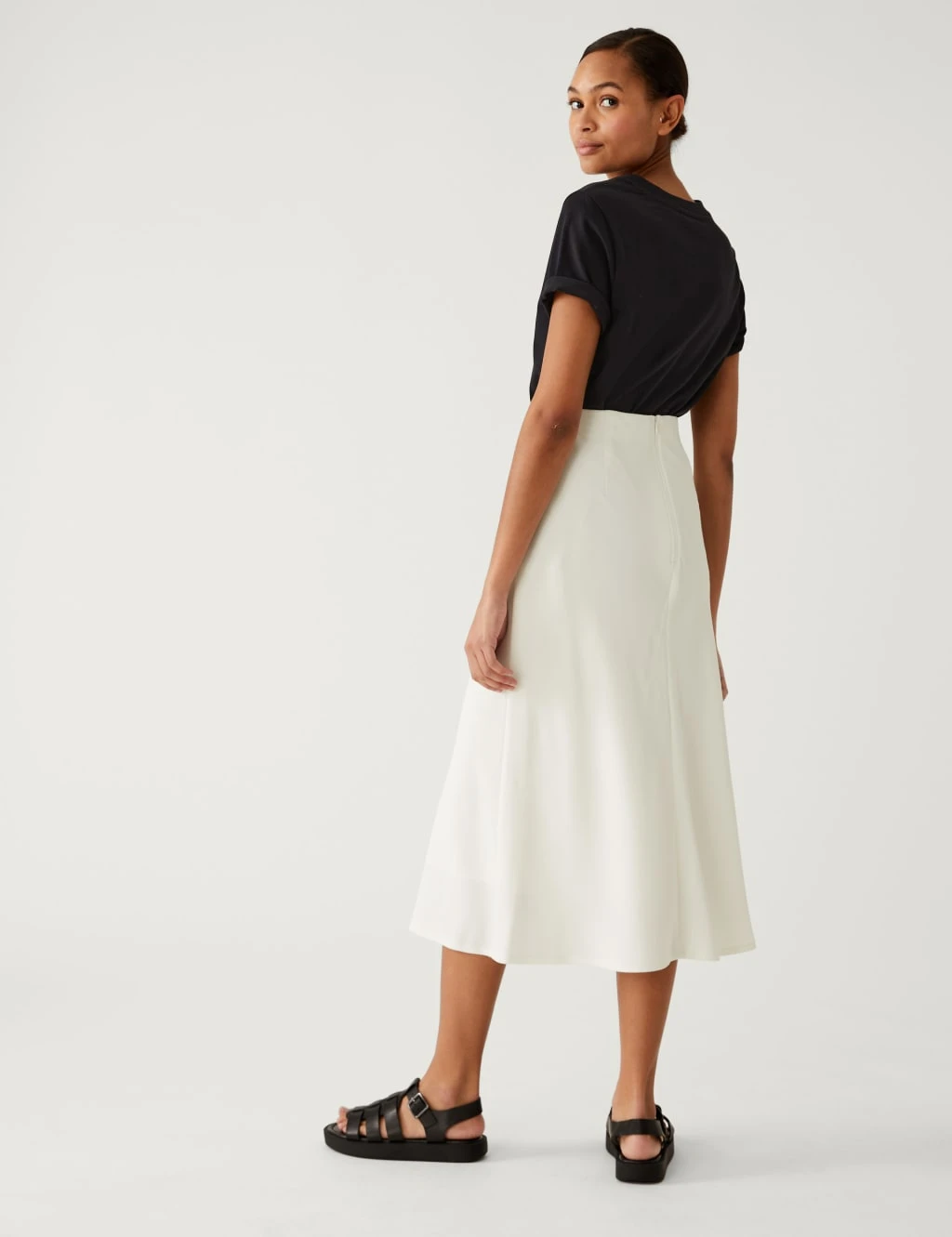 This flowing midaxi skirt is crafted from satin-back crepe that gives it a subtly lustrous look. It’s cut in a circle shape for a beautifully draped silhouette. A discreet side zip fastening ensures a neat touch.