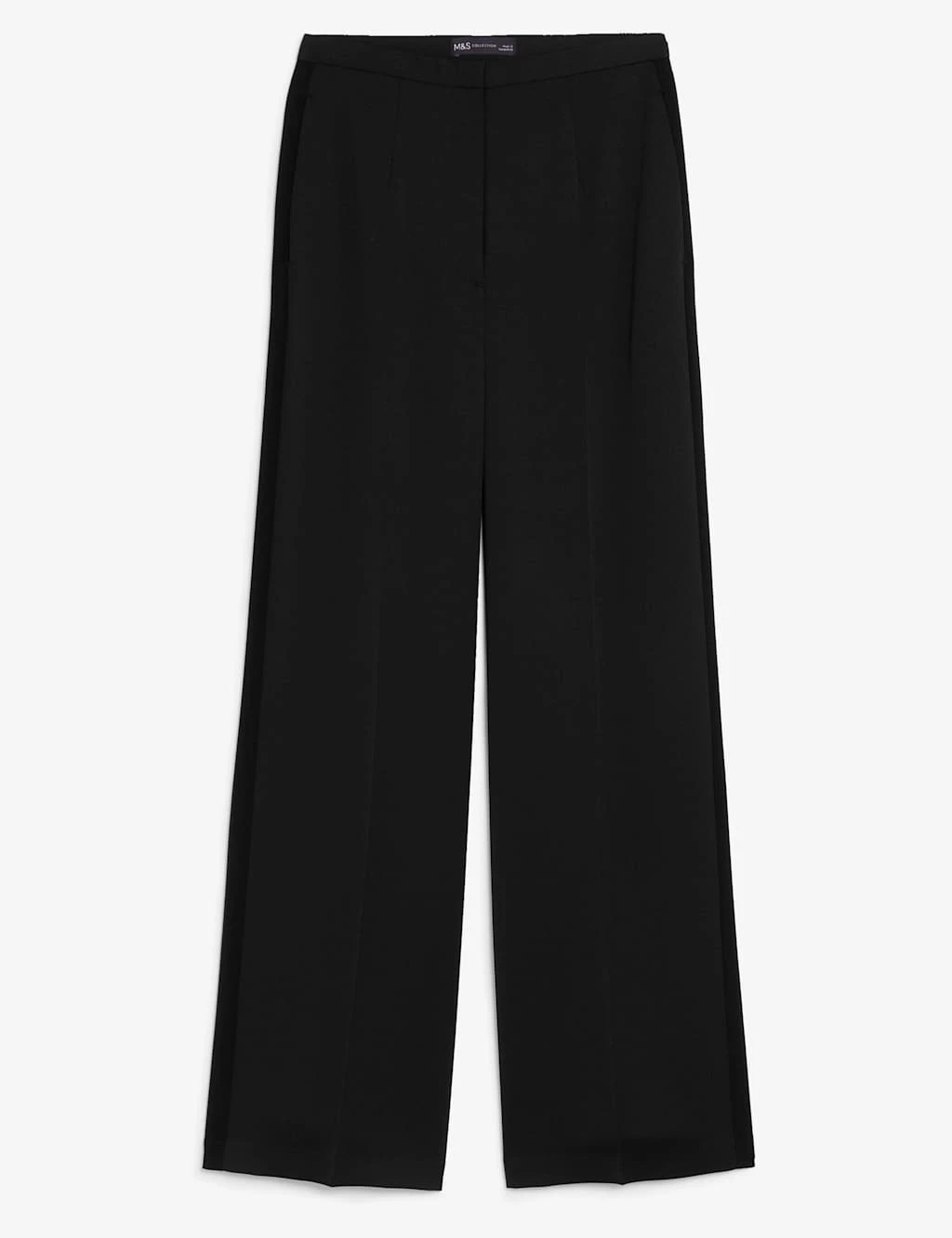 Smooth satin gives these tailored trousers a sleek and sophisticated feel. They’re designed in an elegant wide leg shape, with side panel detailing for a tuxedo-inspired look. The high waistband has a narrow profile and fastens with a secure hook bar and zip. A pair of front pockets are ideal for your essentials, while mock back pockets add a smart finish.
