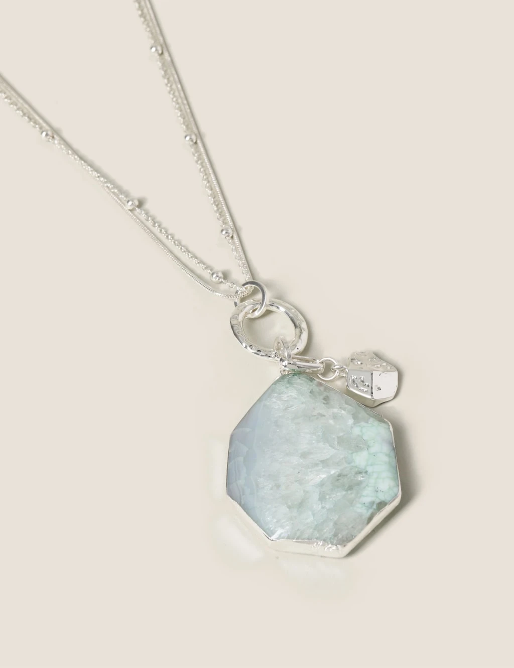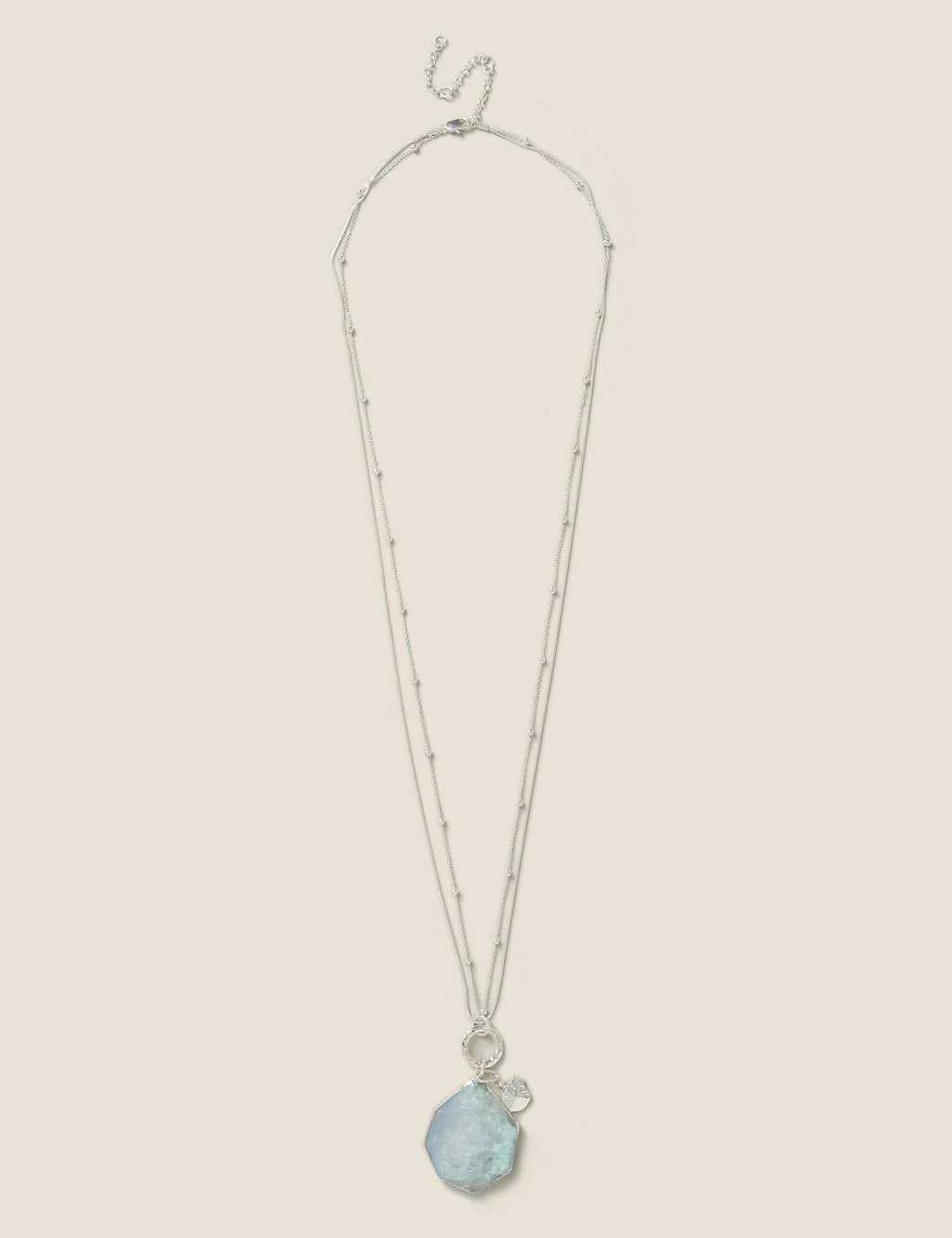 This silver tone necklace has 2 chains 1 ball chain style chain and one fine chain sitting together in a long pendent style. At the end of the chains sits a blue semi precious stone and a silver beaten motif