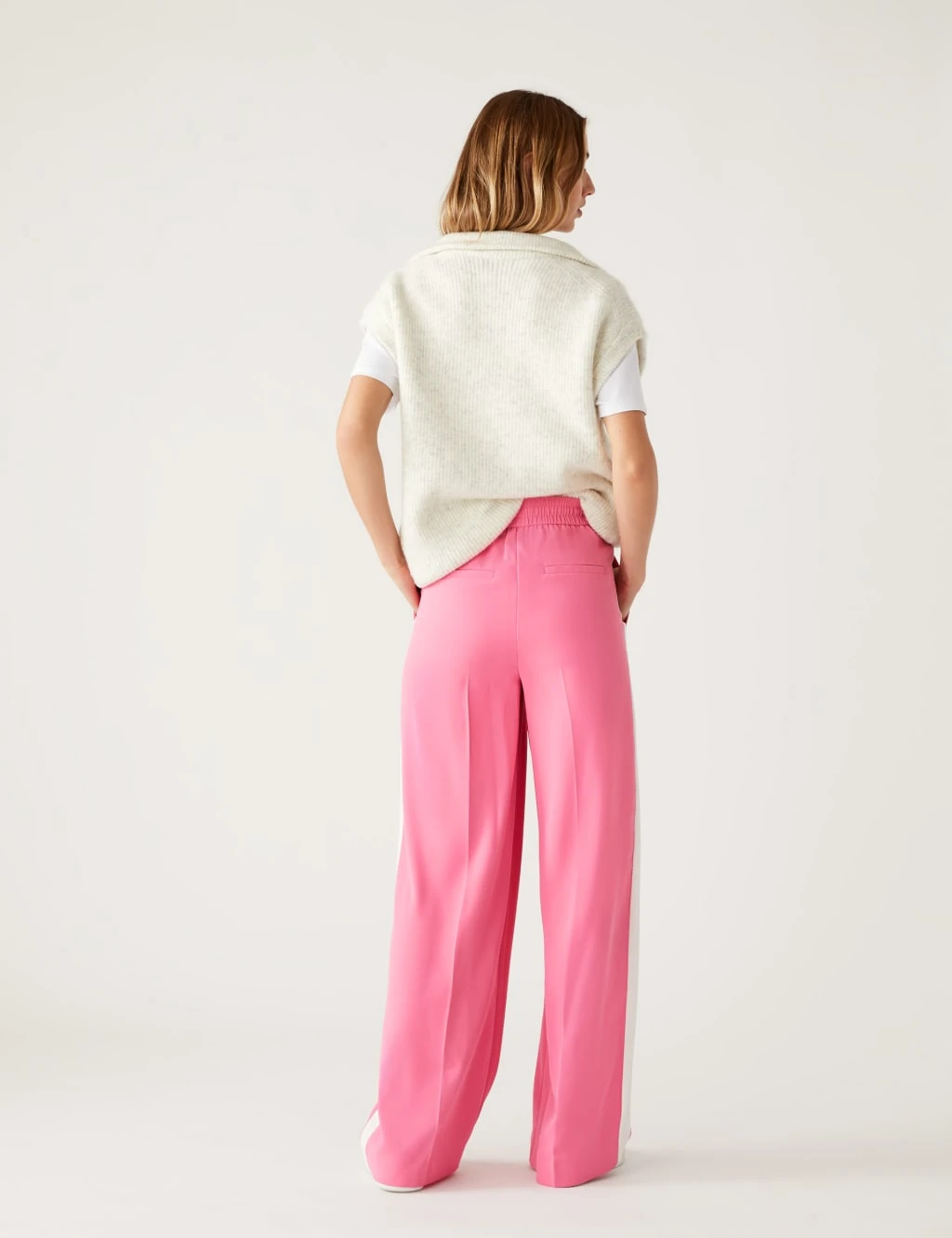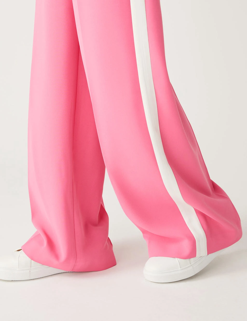Keep it casual with these trousers sporting contrasting side stripes. Designed with wide legs and a high-rise elasticated waist with a drawstring fastening for the perfect fit. Features concealed side pockets for practicality and mock pockets on the back for bonus style points.