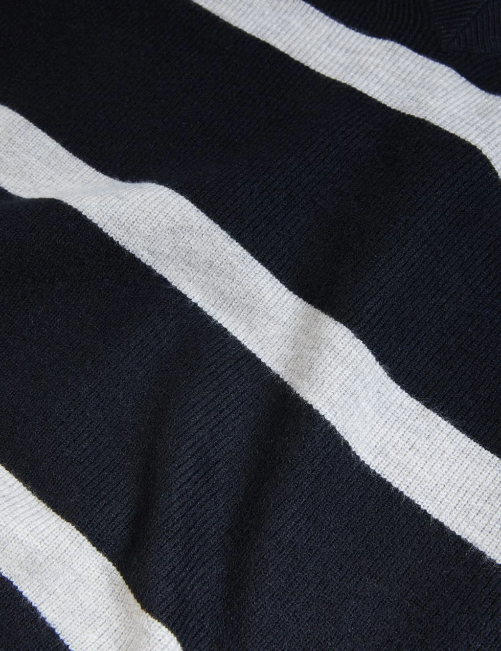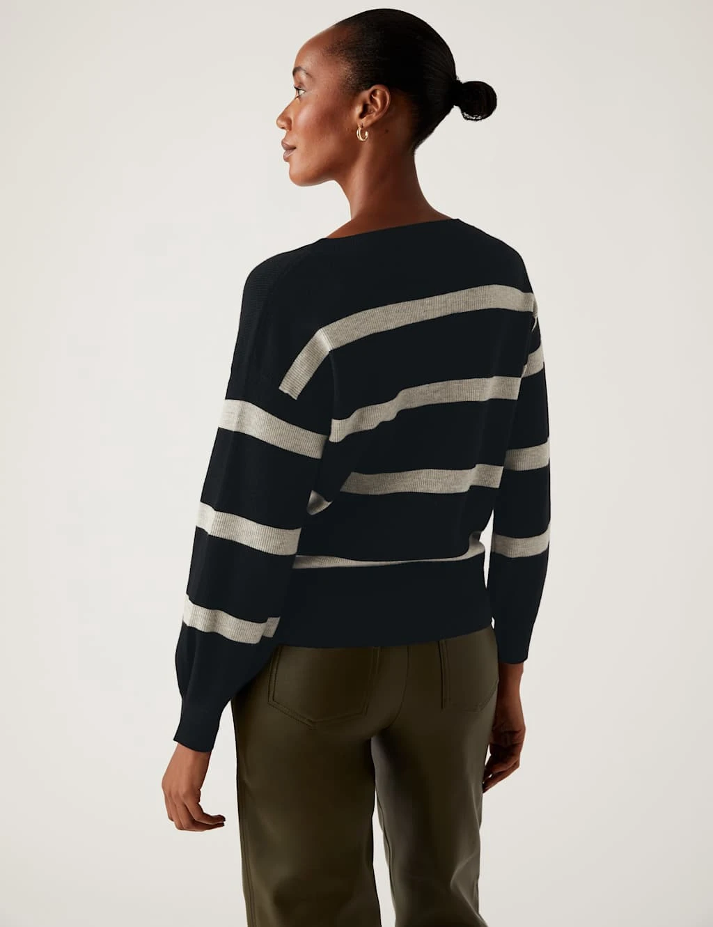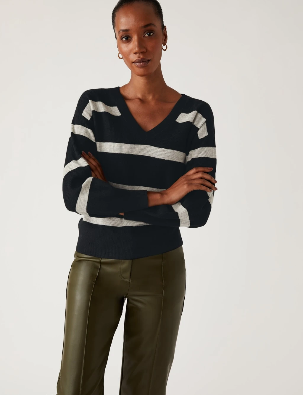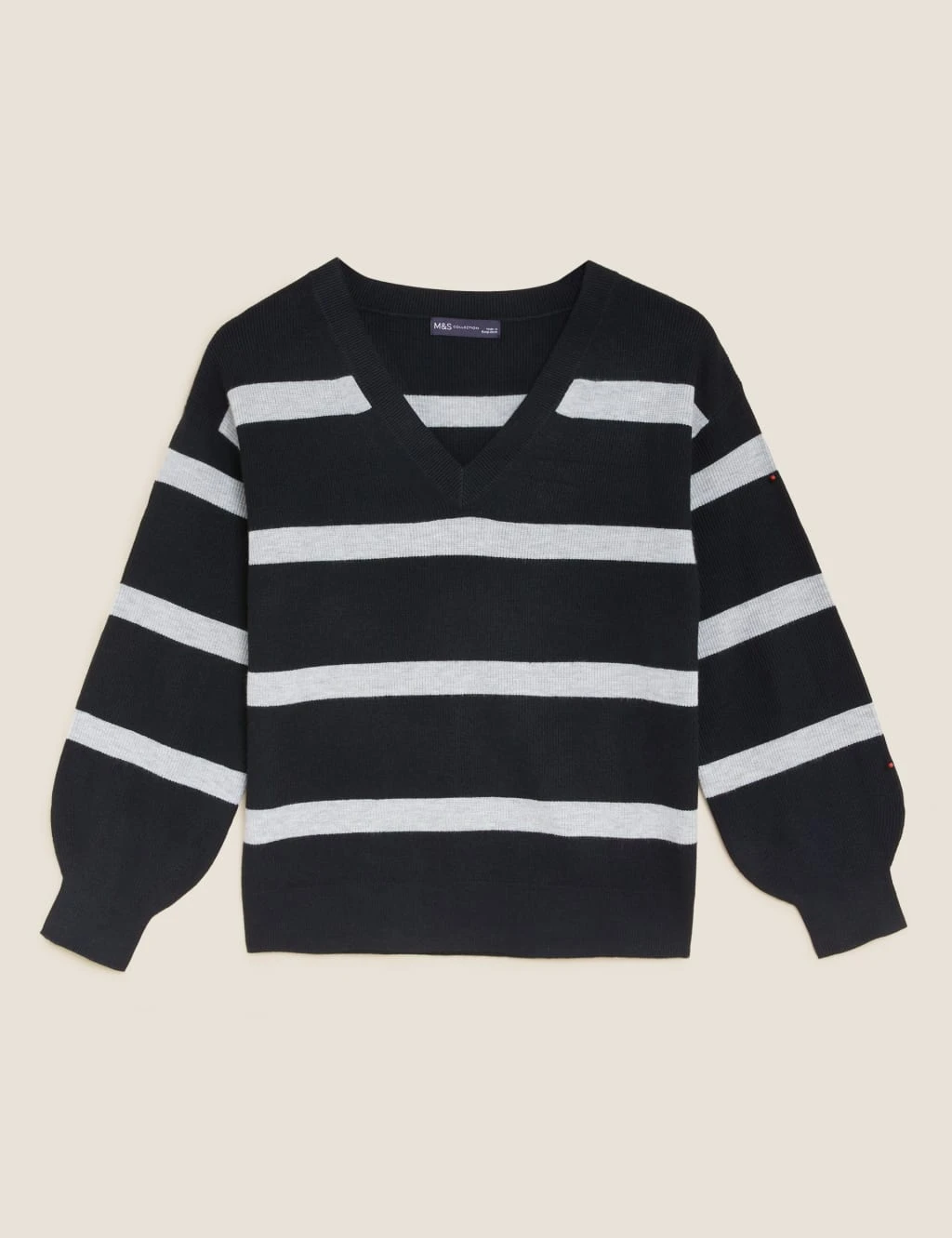 This bold striped jumper is crafted from lightly ribbed, soft-to-touch yarn for a luxurious feel. It has a regular fit, with a v-neck and long voluminous sleeves that create a striking shape. Made with responsibly sourced viscose.