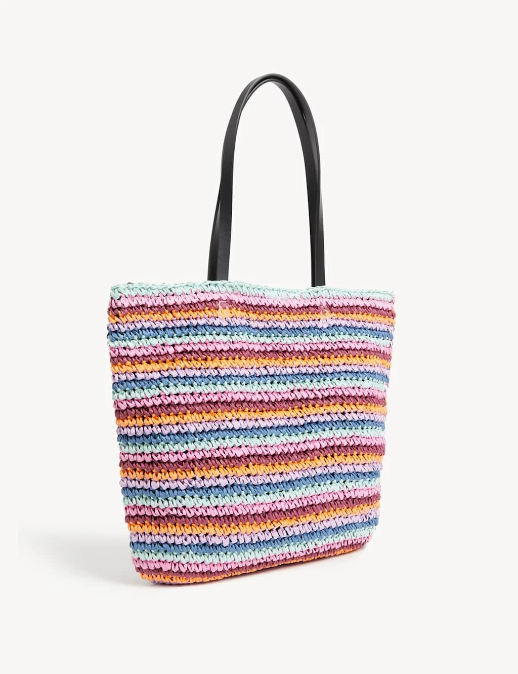 This woven straw tote bag features a bold geometric design for a striking look. It fastens with a secure zip at the top and has classic tote handles that coordinate with the pattern. Inside is a neat cotton lining with a zipped internal pocket. A useful slip pocket is ideal for storing smaller items.