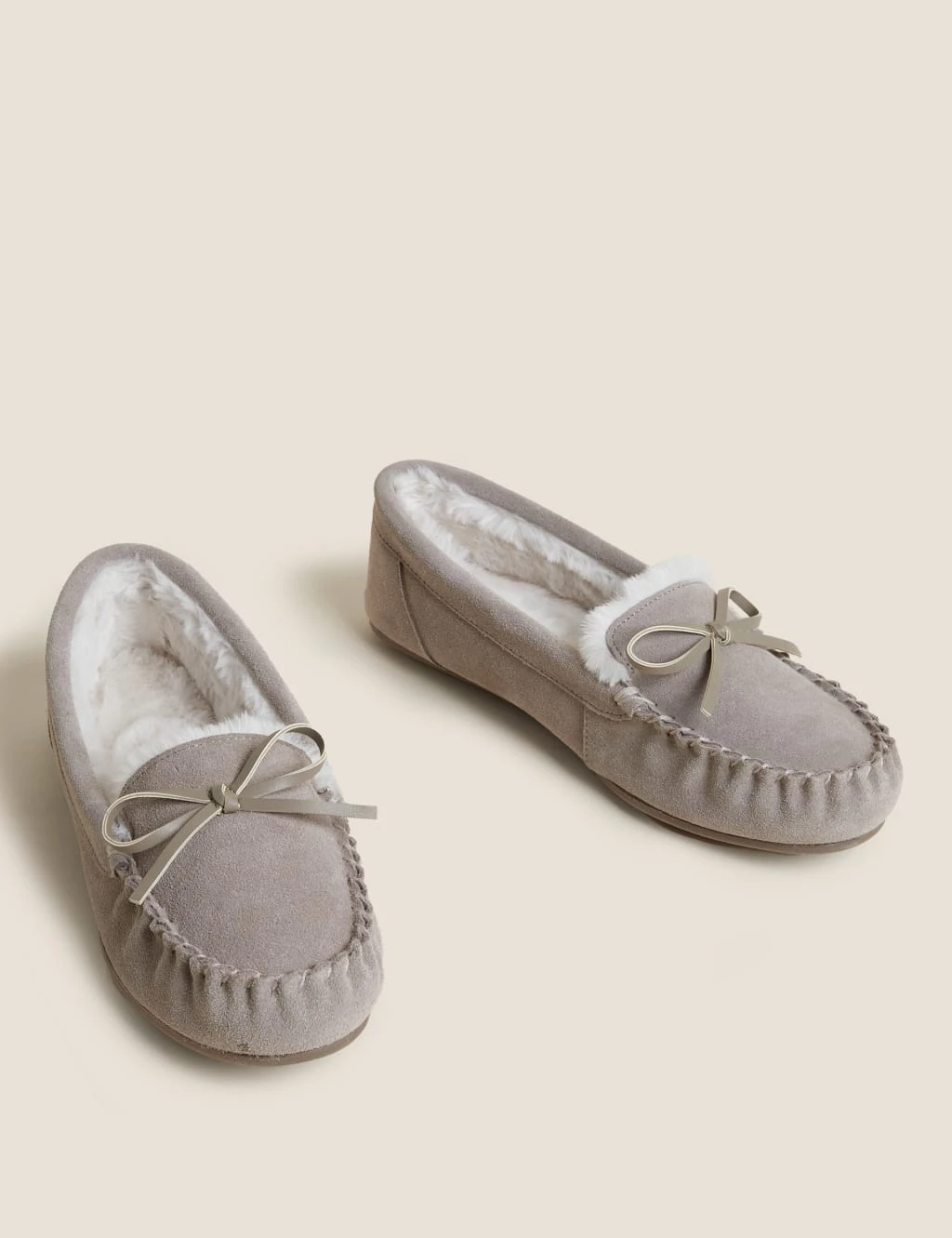 Treat your feet to the effortless comfort of these soft suede moccasin slippers. Snuggly faux fur sock and lining. The soles are textured for extra grip and a neat bow on the toes adds the finishing touch.