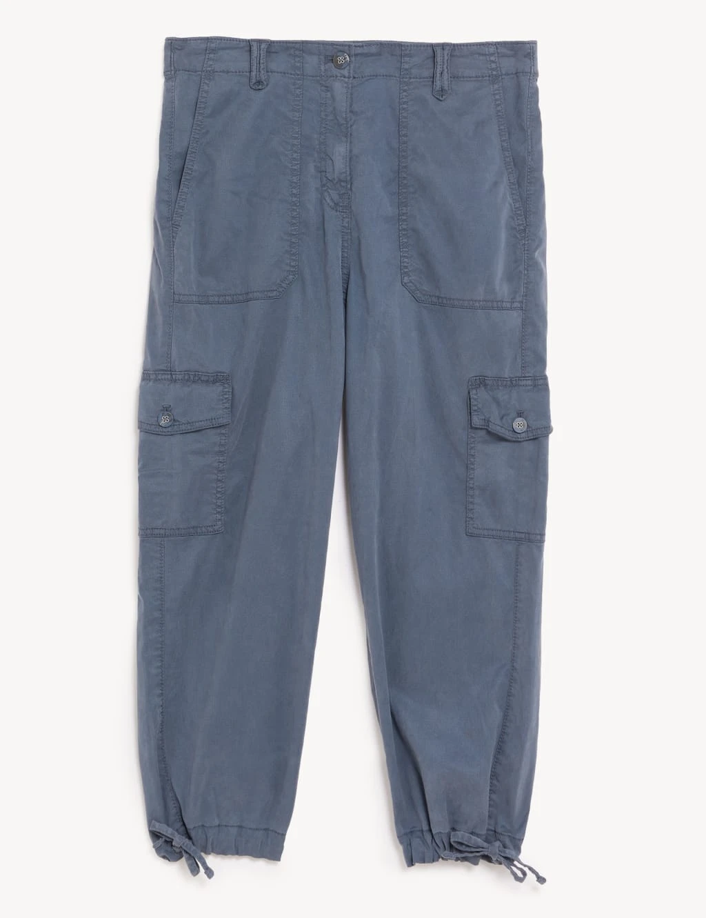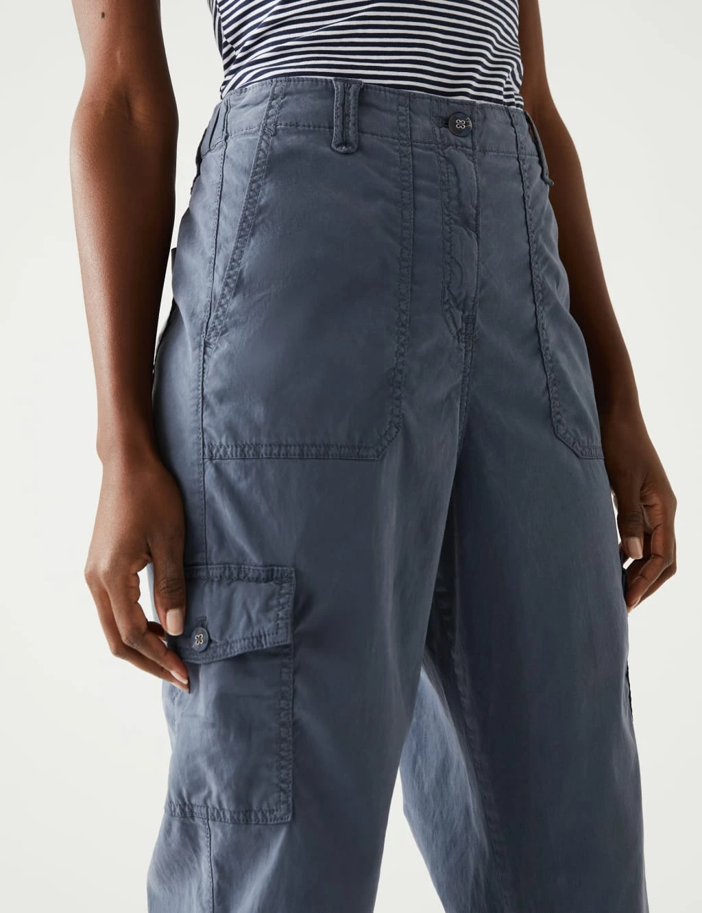Keep it casual with these tea-dyed, Tencel™-rich trousers. Regular fit, with a high waistband that’s elasticated at the back for all-day comfort. Cropped length adds a laid-back feel while tie details at the hem give a flattering look. Back and leg patch pockets and belt loops bring an authentic cargo-style look. Complete with flexible added stretch.
