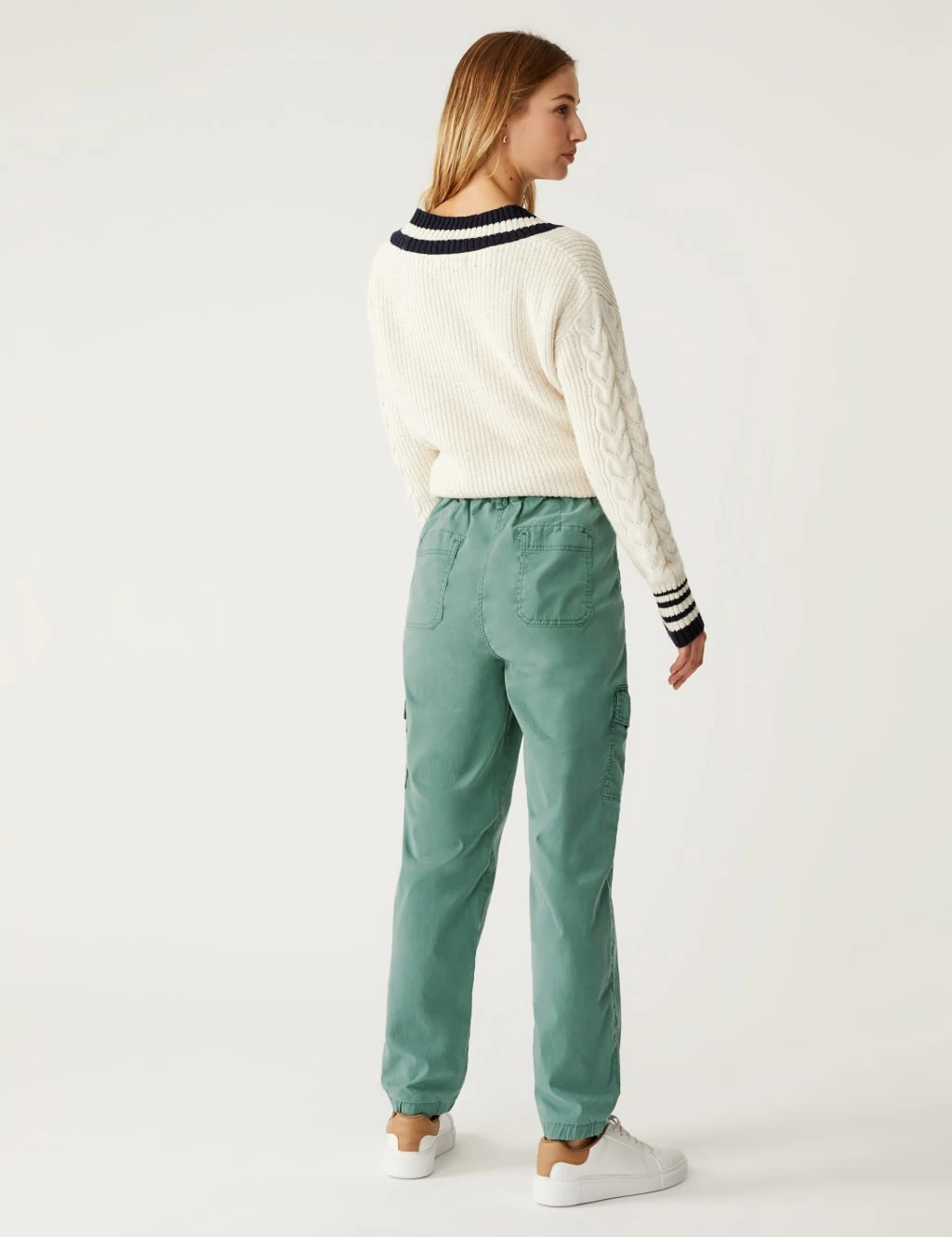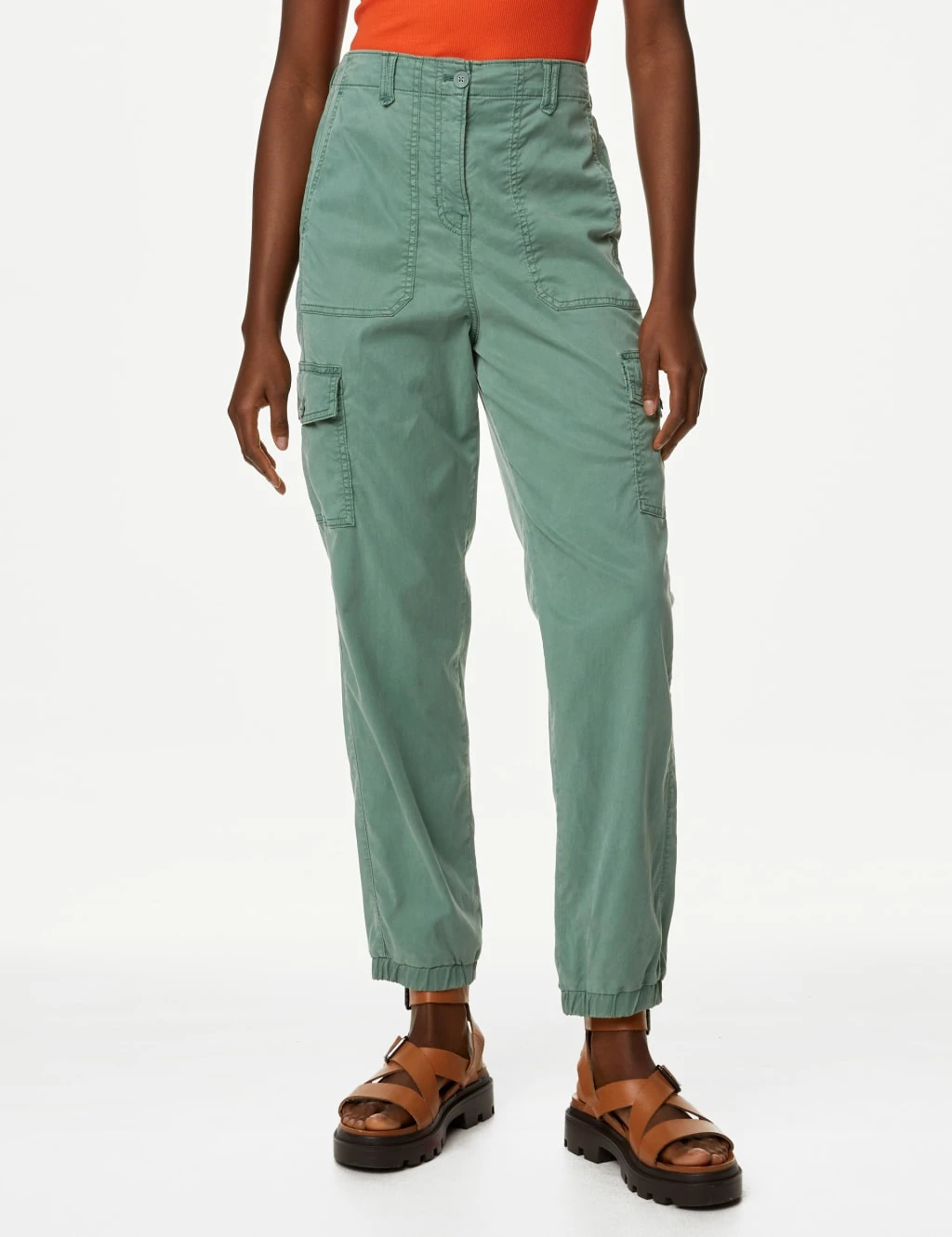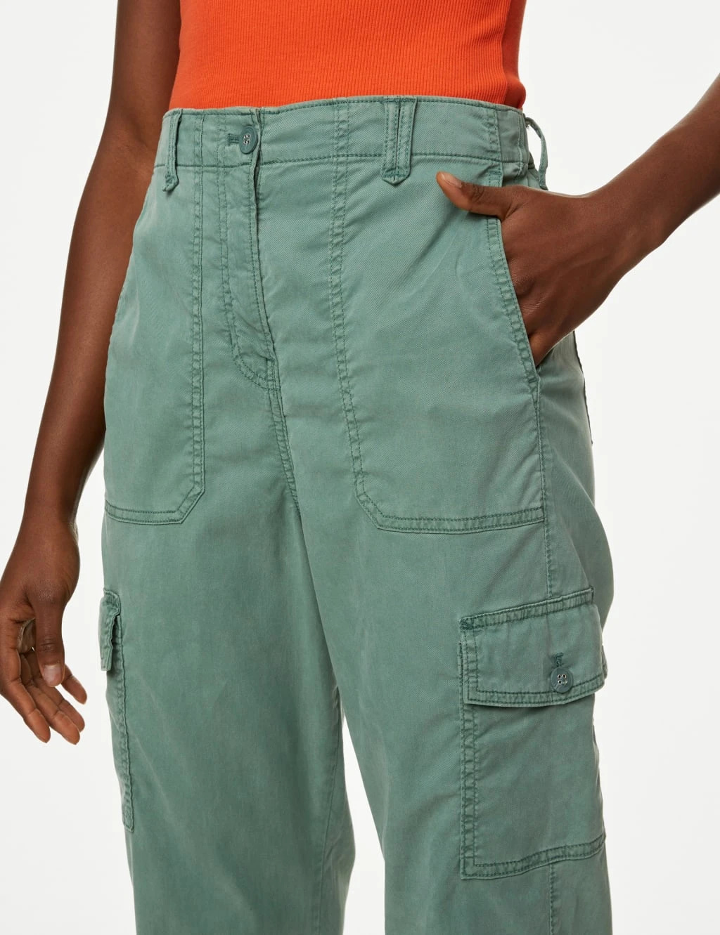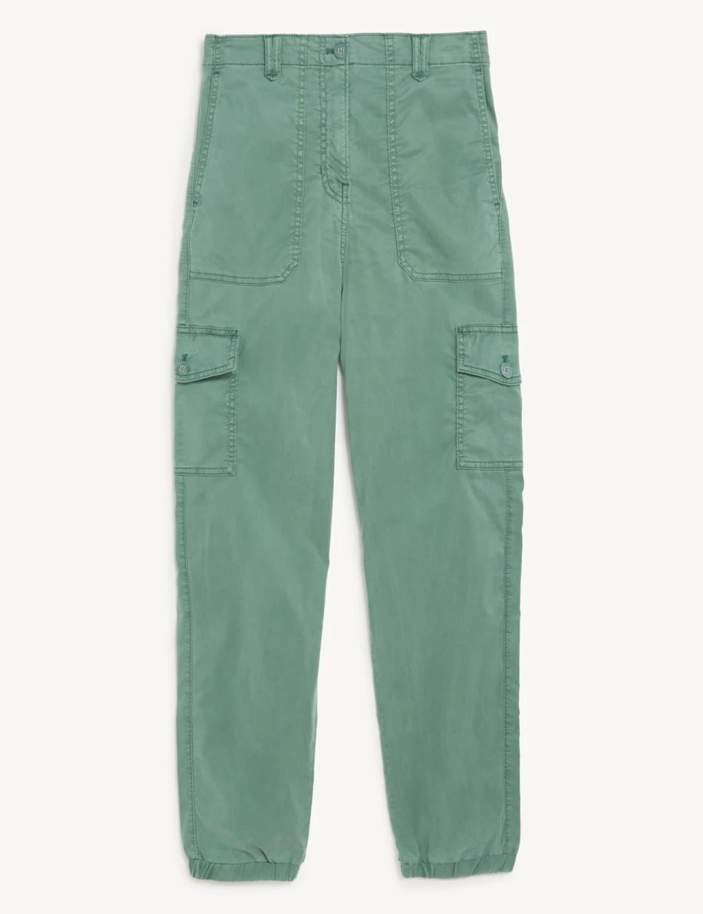 Fashion meets function in these Tencel™-rich cargo trousers, which have been tea-dyed with natural colourants for less environmental impact. Flattering mid-rise design, with straight legs and an ankle-grazer length. The fabric contains added stretch, while elasticated trims at the back of the waist and the cuffs offer comfortable wear. Belt loops, multiple pockets and a classic button and zip fastening complete the casual design.