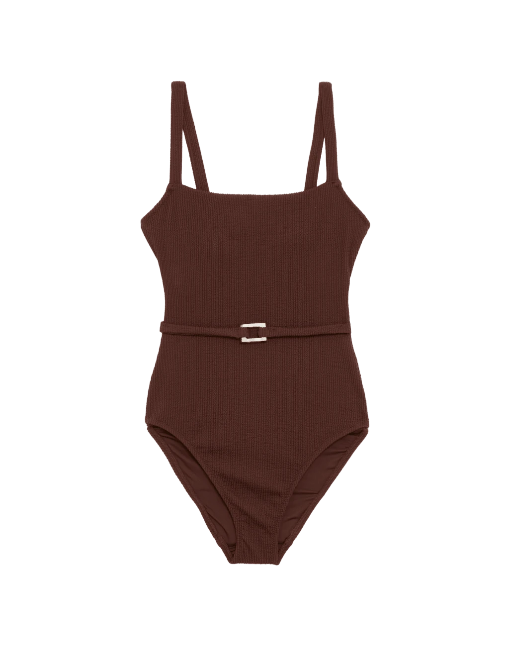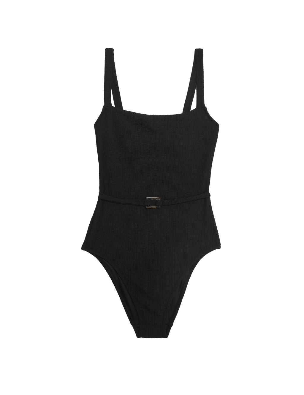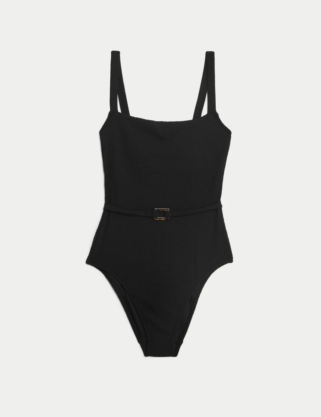 For a classic look at the pool or beach, slip into this stylish textured swimsuit. Regular fit, with a flattering square neckline and waist belt to accentuate your figure. Removable padded cups provide optional extra support. Our innovative chlorine-resistant fabric stays looking newer for longer, while UPF50+ Sun Smart technology helps protect against harmful UV rays. M&S Collection: versatile styles in modern shapes with unique and playful details.