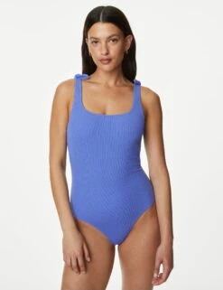 Tie details on the shoulders add a pretty look to this classic swimsuit. Made from textured fabric for a premium feel, with added stretch for freedom of movement. A durable chlorine-resistant finish keeps the material looking like new for longer. Clever Sun Smart technology helps protect skin from harmful UV rays.