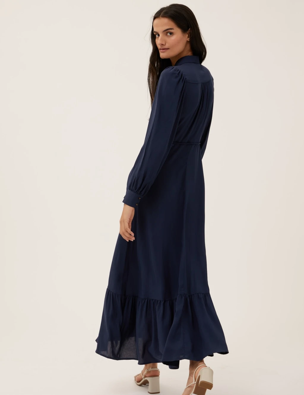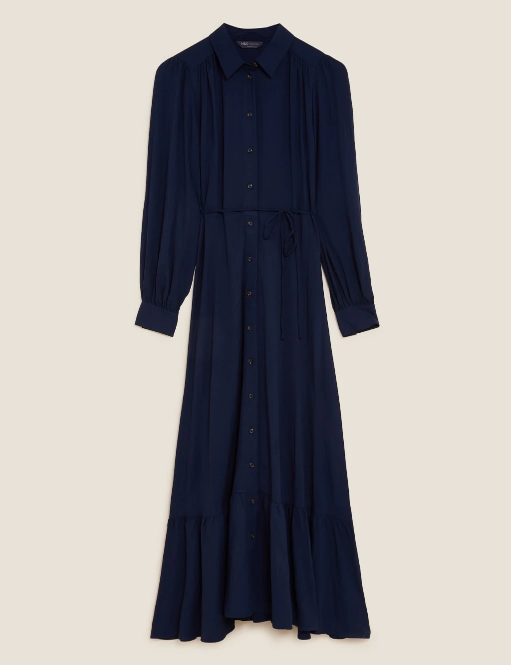 Bring an elegant effect to your ensemble with this maxi shirt dress. It’s cut in a regular fit with a tiered skirt and a self-tie fabric belt at the waist for flattering shaping. A button-down front, long cuffed sleeves and a smart collar create a neat finish. M&S Collection: easy-to-wear wardrobe staples that combine classic and contemporary styles.