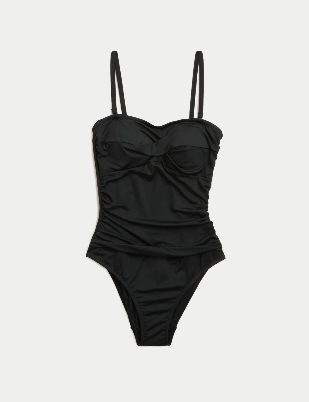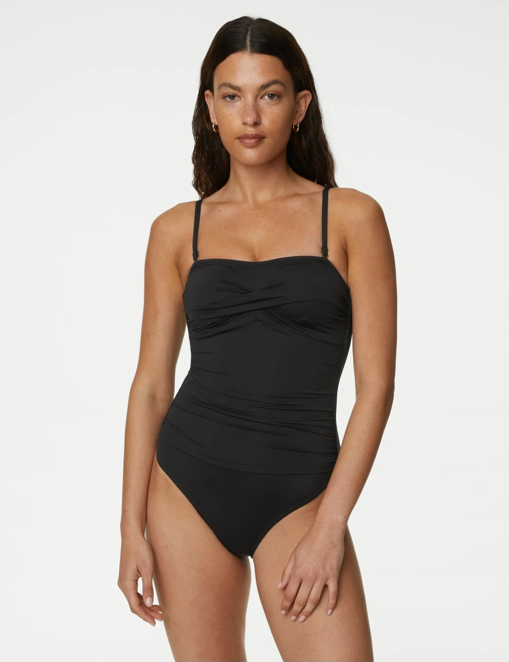 Bring chic style to the poolside with this bandeau swimsuit. Regular fit, with padded cups and ruched sides for flattering shaping. A hidden lining of Secret Slimming power mesh helps to sculpt your figure further. We’ve also added plenty of stretch for comfortable wear. The adjustable straps can be detached allowing you to wear the swimsuit as a strapless style. Made with recycled nylon.