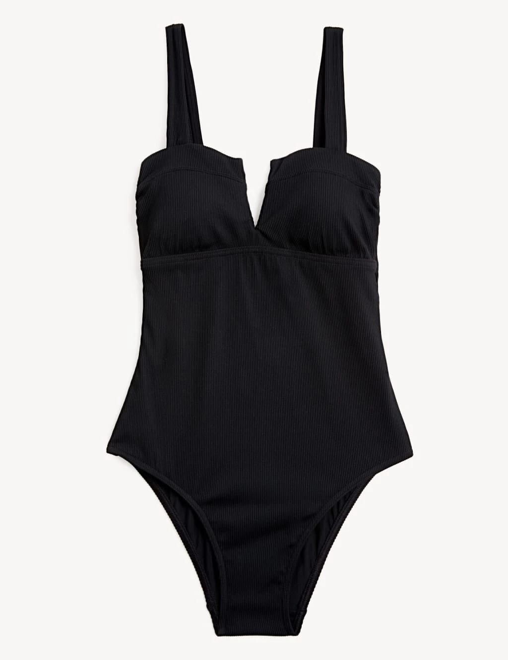 When the water calls, this ribbed swimsuit answers. It comes in a regular fit with Magic 360 technology for an ultra-flattering silhouette. A plunging v-neck and padded cups further accentuate your figure. Sun Smart UPF50+ fabric helps protect against harmful UV rays, while added stretch and a full lining offer a comfortable feel. M&S Collection: versatile styles in modern shapes with unique and playful details.