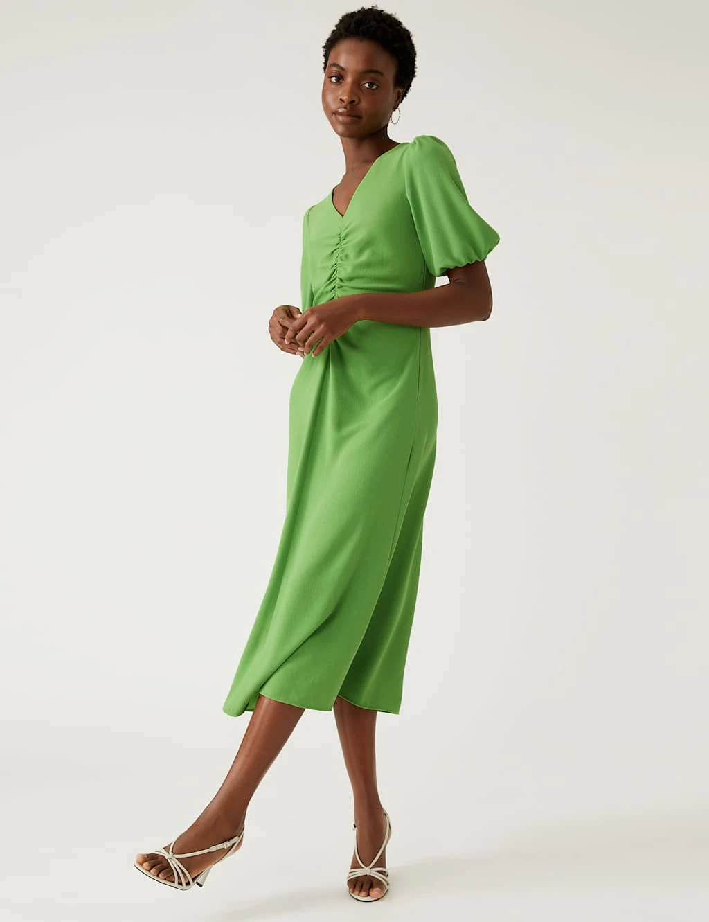 This tea dress is ruched beneath the v-neck to create a flattering silhouette. It’s cut to a regular fit, with a versatile midi hem and comfy added stretch. A zip fastening offers a neat finish.