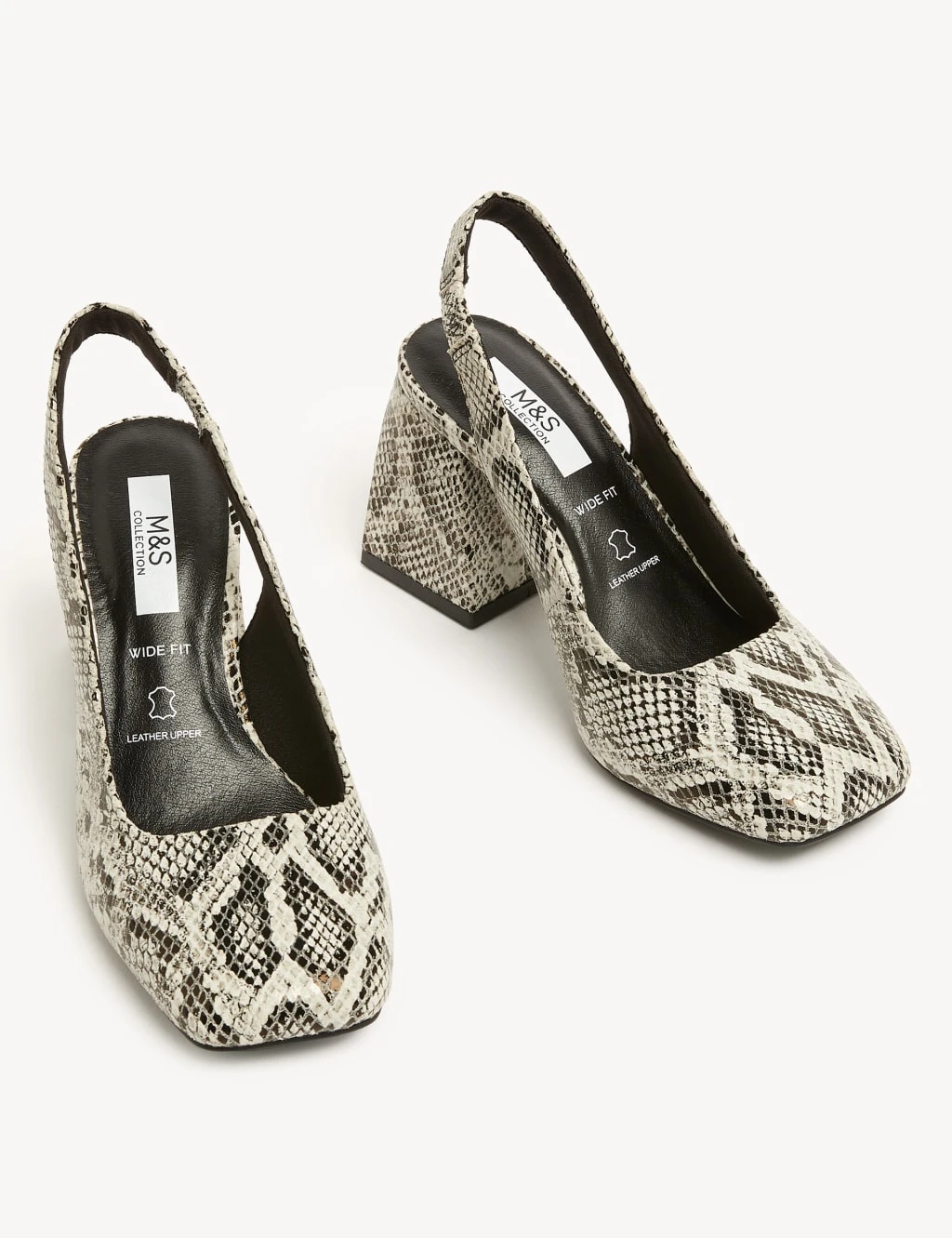 Make a bold statement with these gorgeous leather snake print shoes. Comfortable wide fit in a contemporary slingback style. Features high block heels and a flattering square toe. Crafted with Insolia® technology, which increases ankle stability to help you walk in heels more comfortably. Antibacterial padding helps your feet stay fresh.