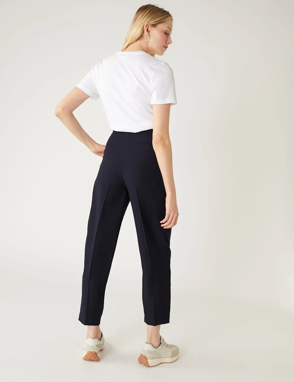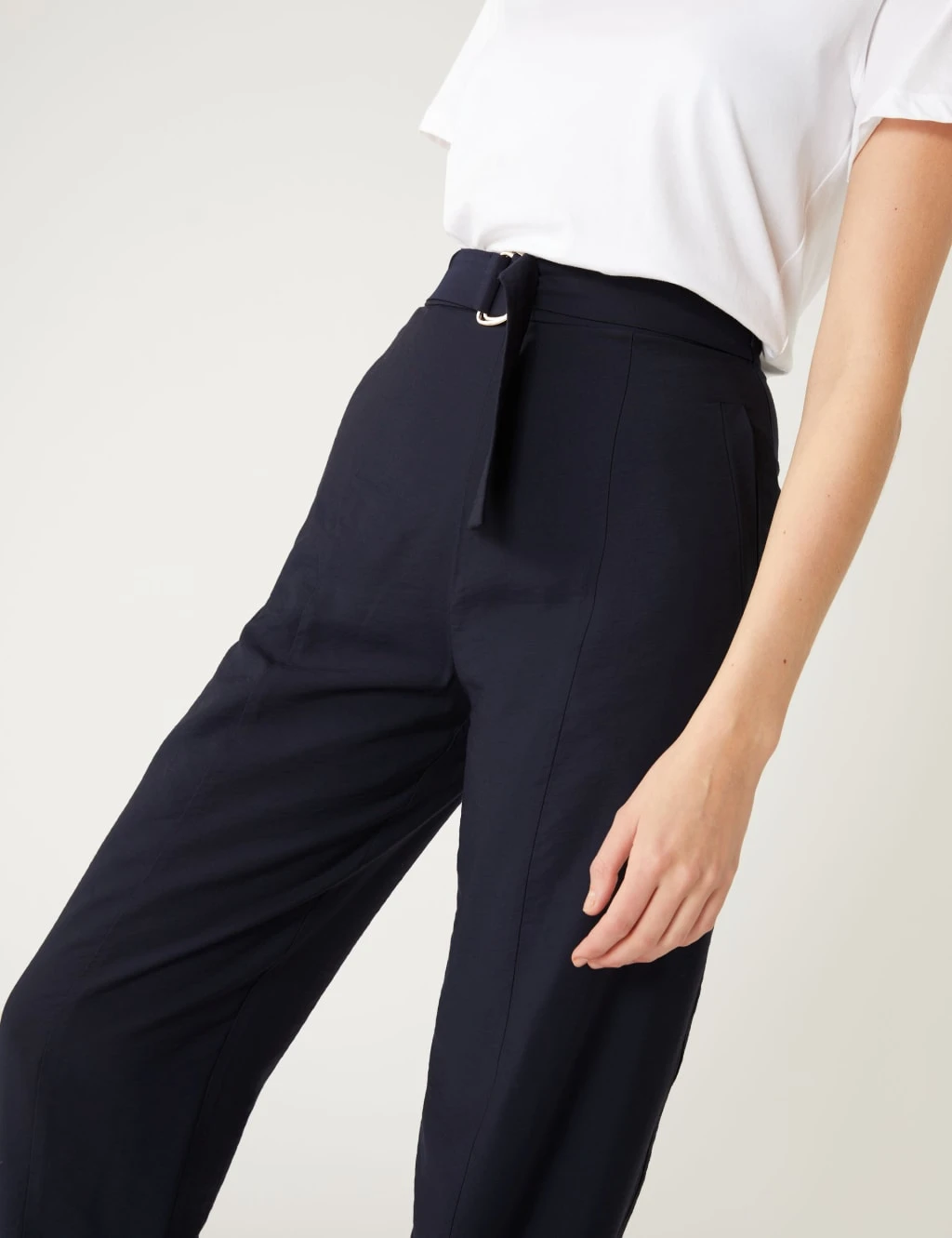These woven trousers are made from crinkle-textured fabric for a casual feel. They have full tapered legs that finish at a contemporary ankle-grazer length. The high waist fastens with a hook bar and zip, while a coordinating belt allows you to achieve a comfortable fit. A pair of side pockets give an extra practical finish.