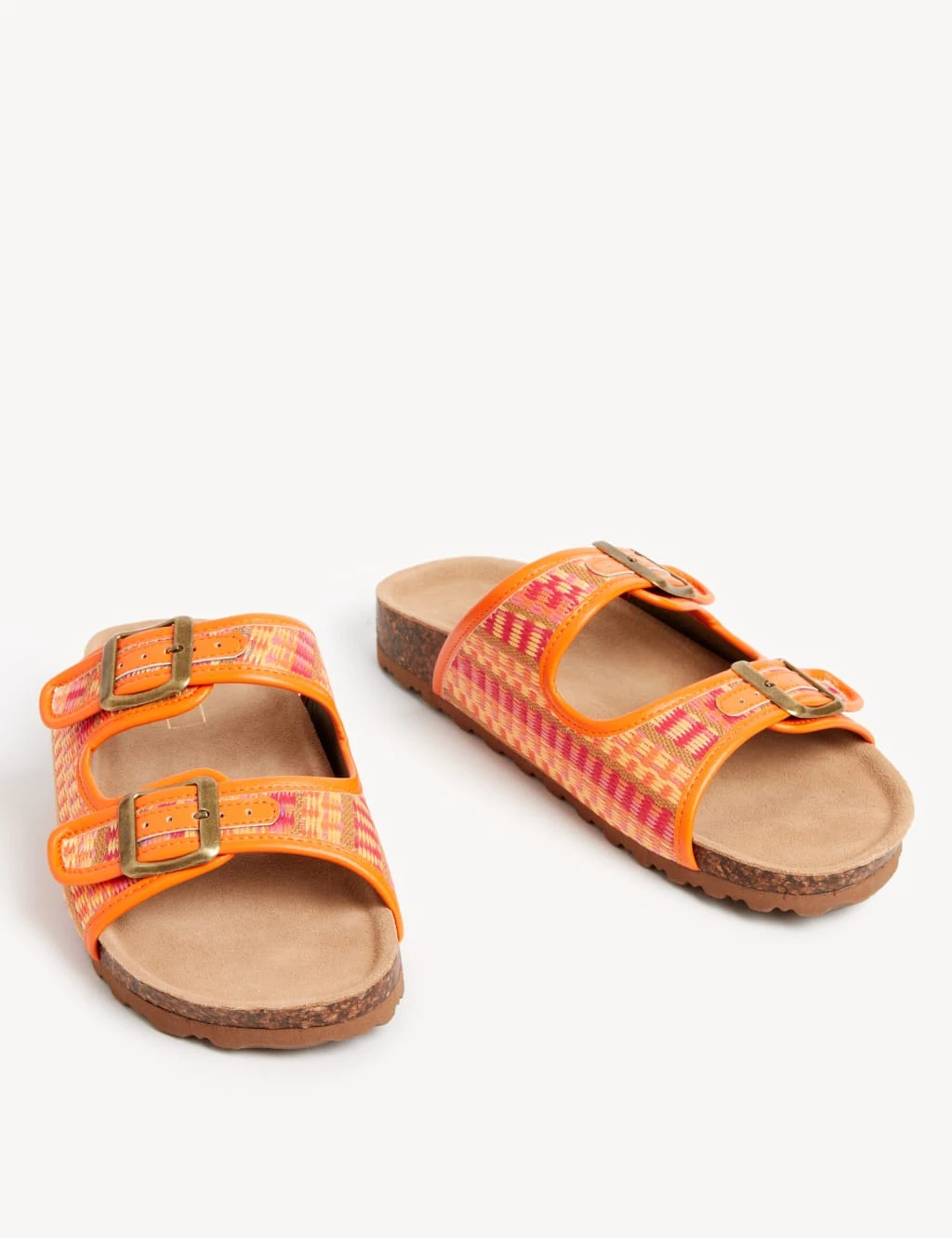 These slip-on mules are great for those sunny days. Flat heel with a leather-lined footbed and antibacterial padding for extra comfort. The colourful woven upper and buckled straps complete the vibrant look.