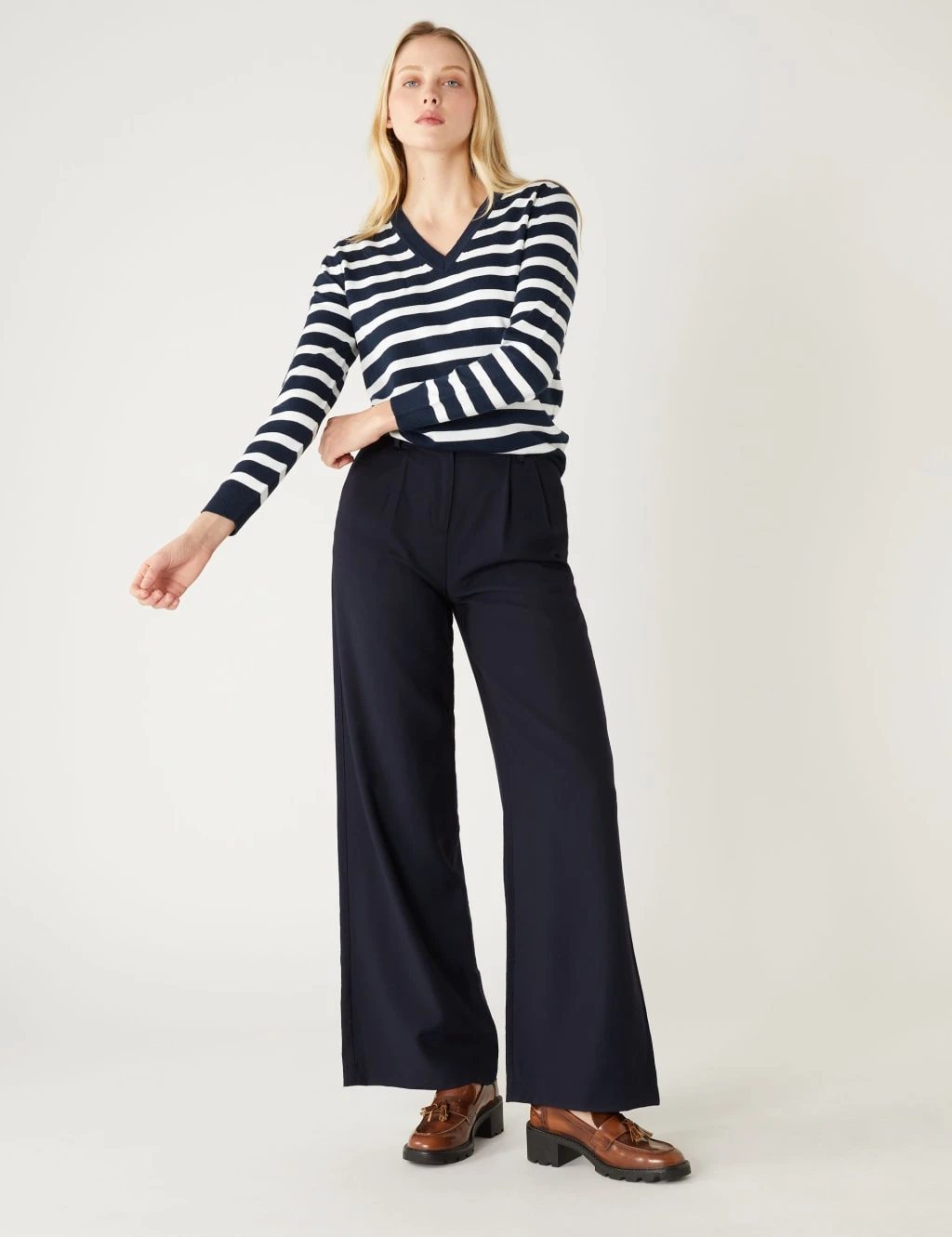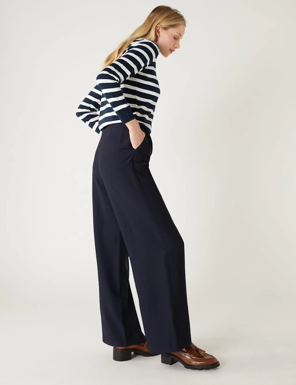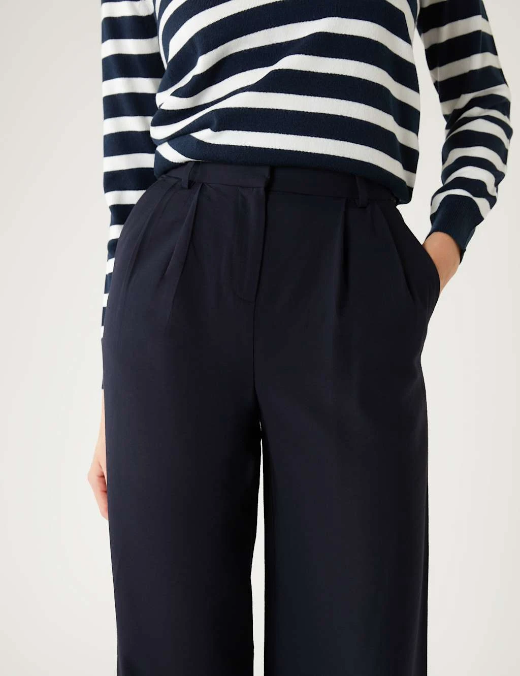 The two front pleats on these woven trousers help them hang elegantly for a smart look. They have stylish wide legs and a high waistband, which has a concealed hook, bar and zip fastening. The crinkle textured fabric gives a subtle crinkle finish.