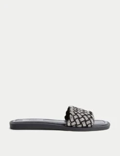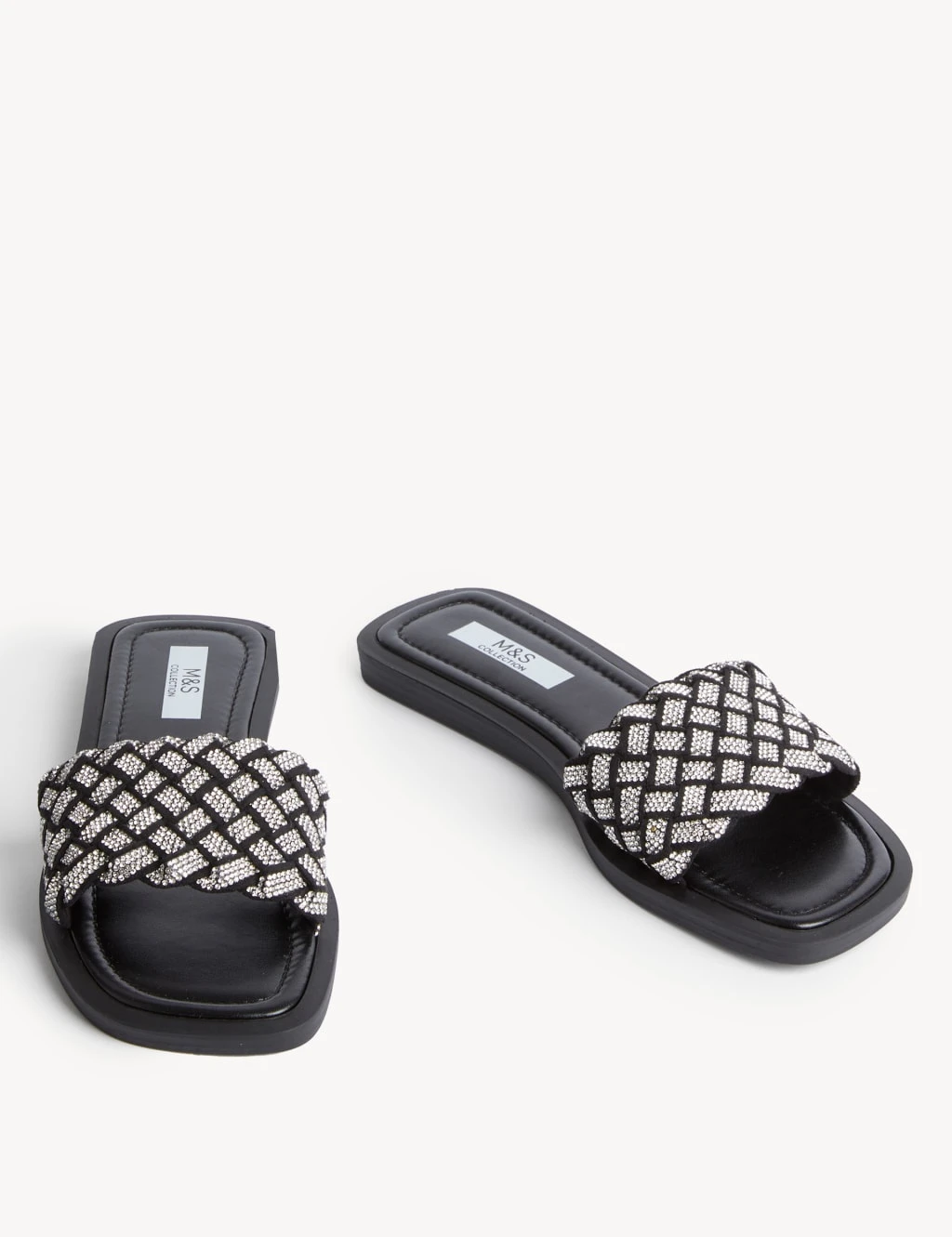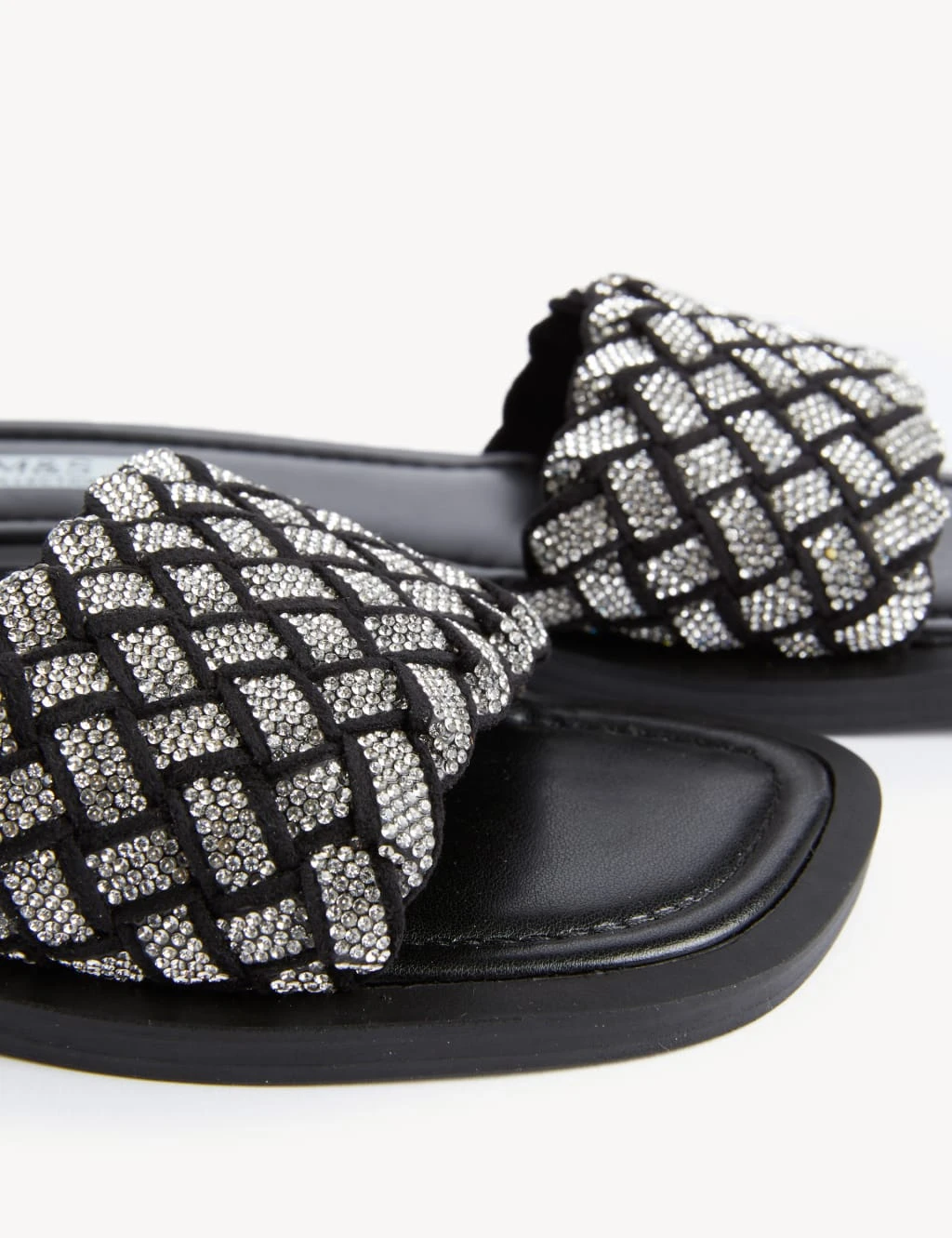 Sparkling details bring a touch of luxury to these stylish woven sliders. Easy slip-on design, featuring a comfortable flat heel.