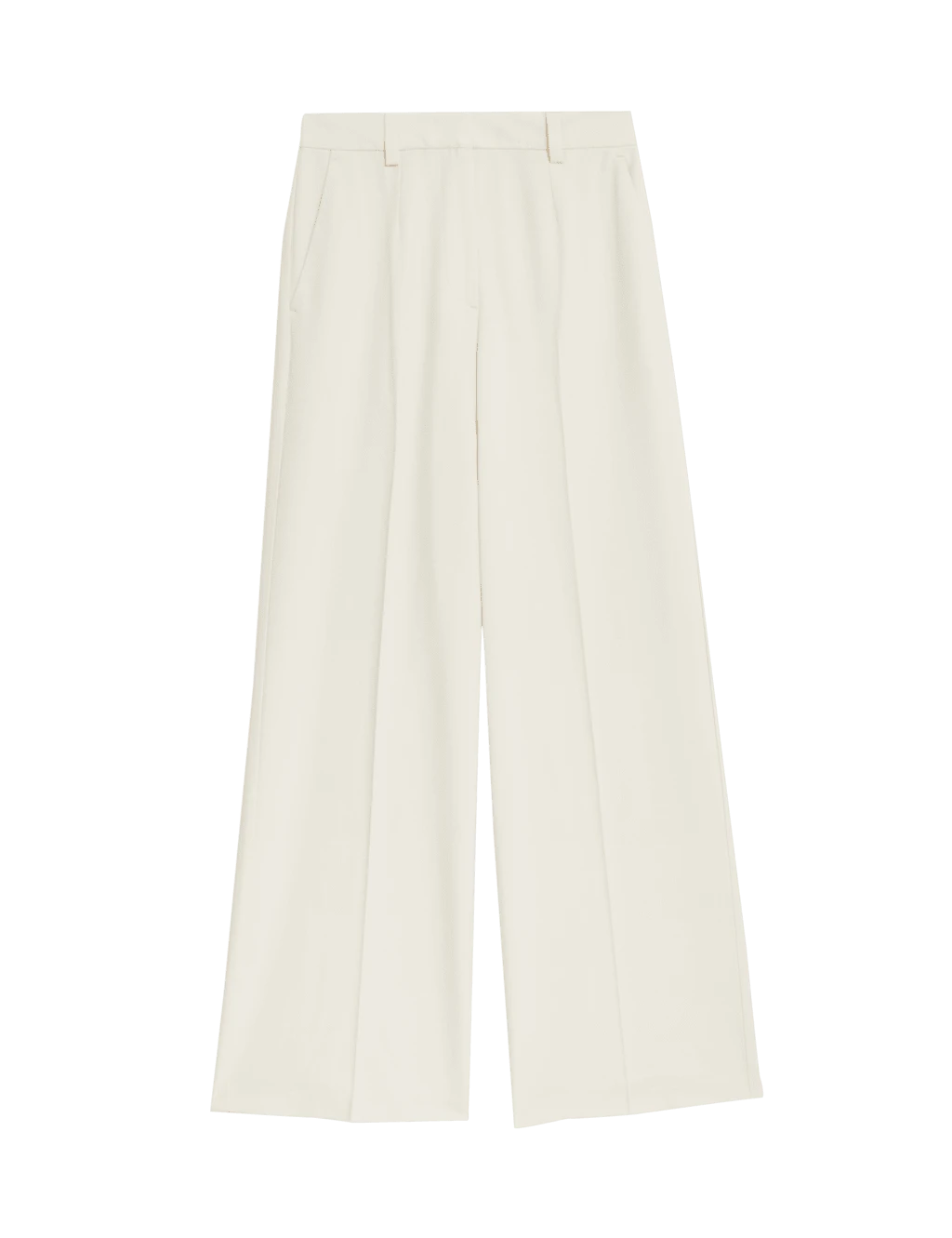 These woven trousers are a versatile addition to your smart wardrobe. Wide-leg cut, with a high waist and front creases for a flattering look. They’re made with added stretch for comfort and feature a hook bar and zip fastening. Complete with angled side pockets.M&S Collection: easy-to-wear wardrobe staples that combine classic and contemporary styles.